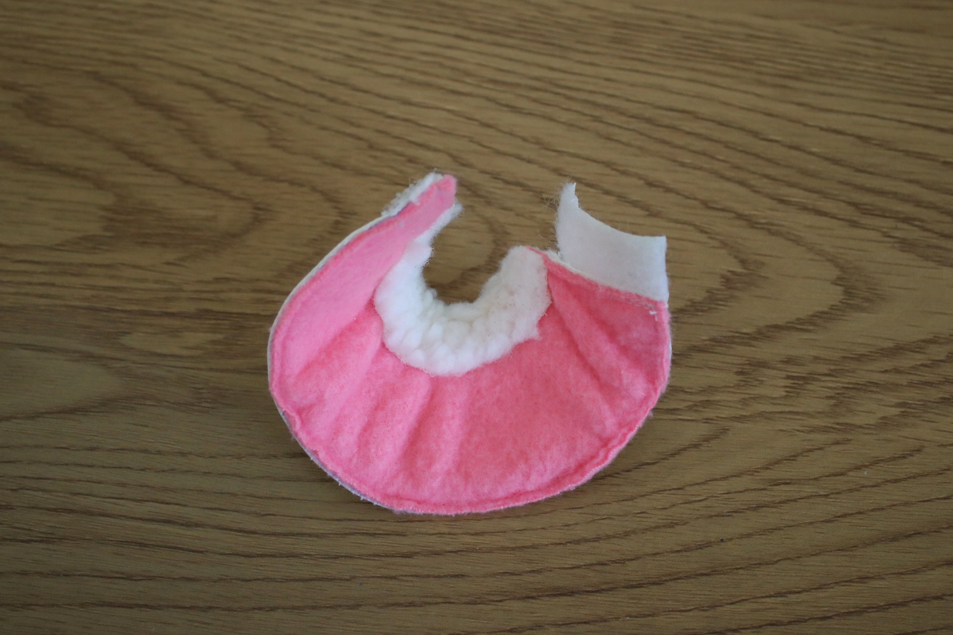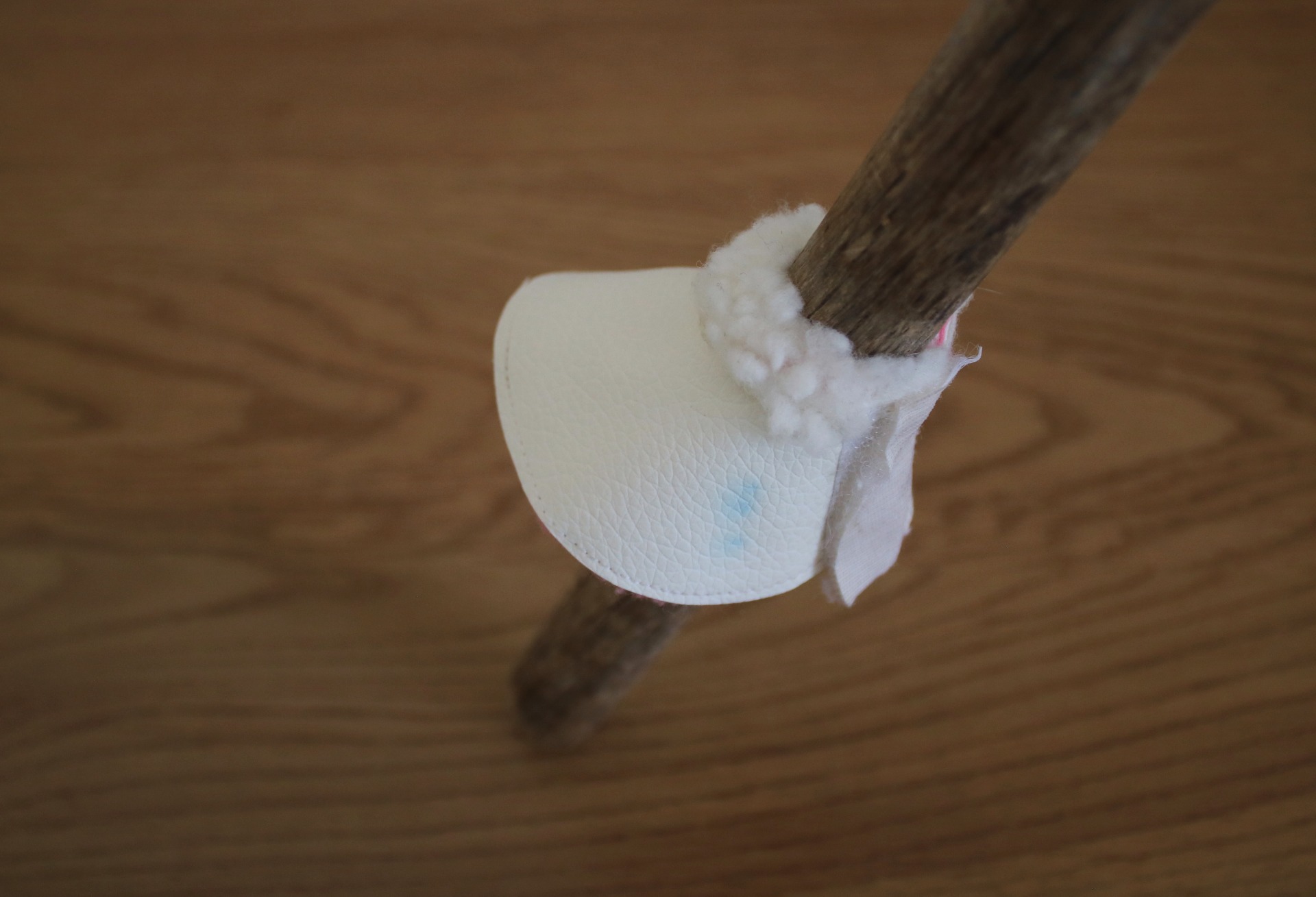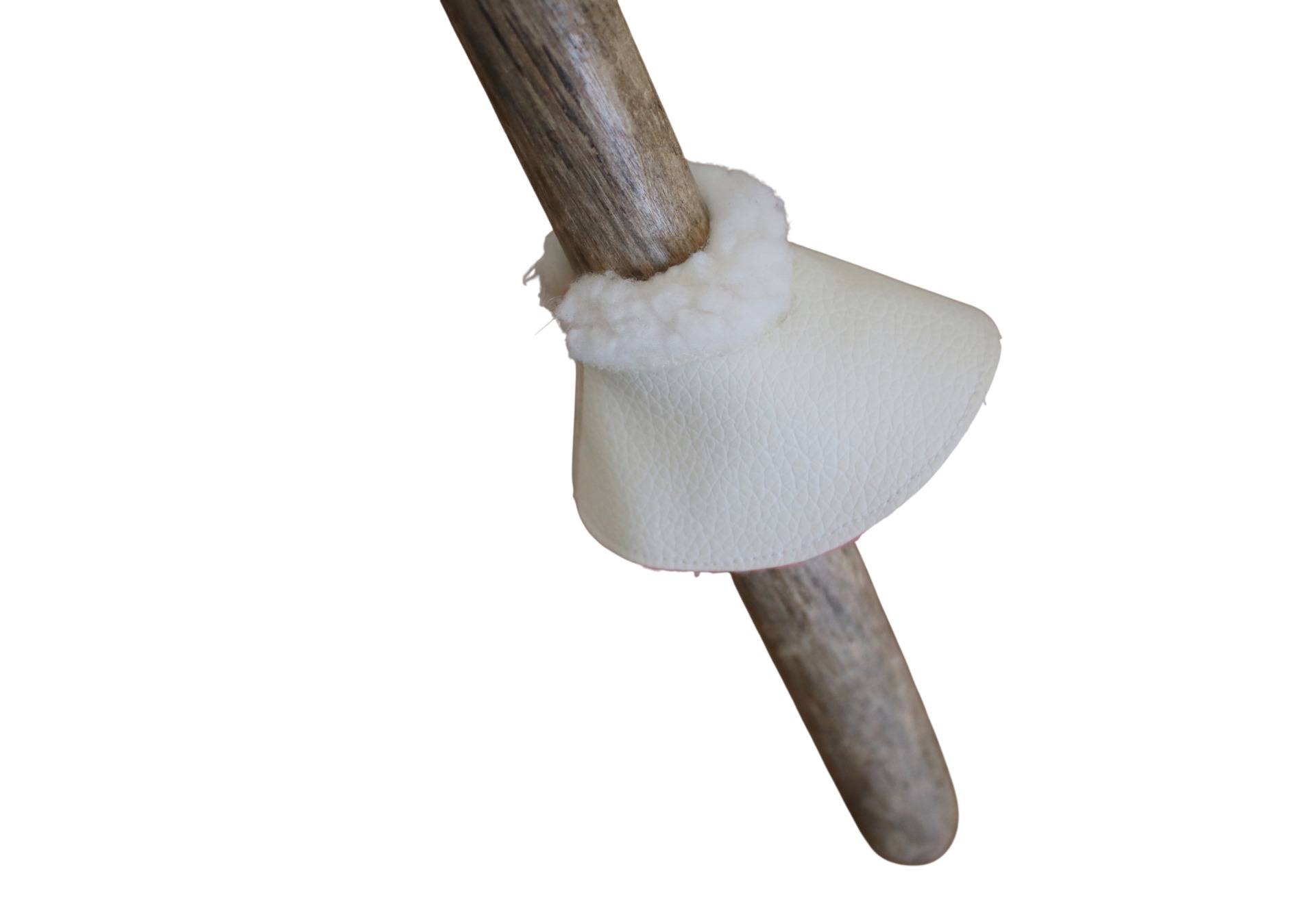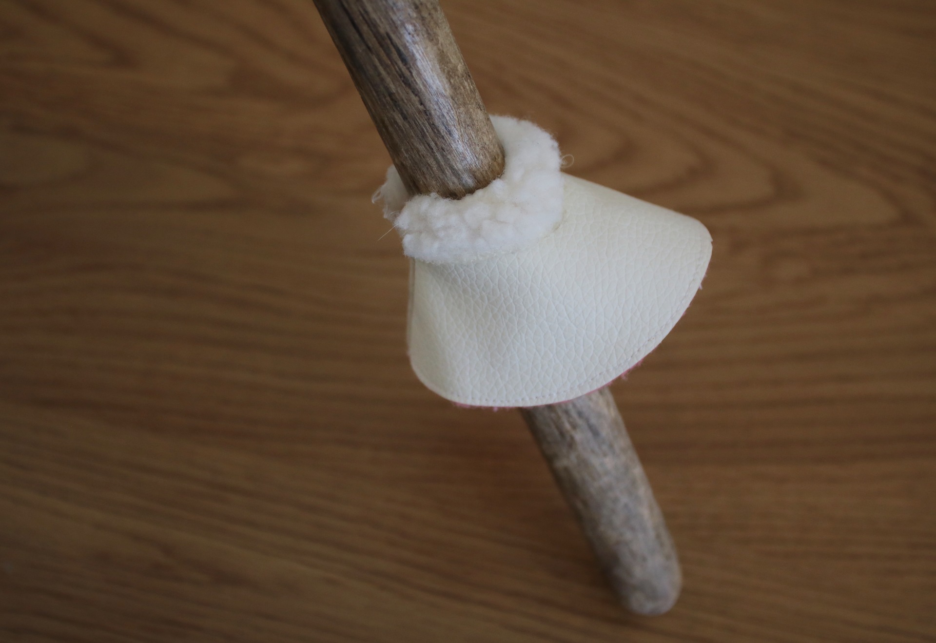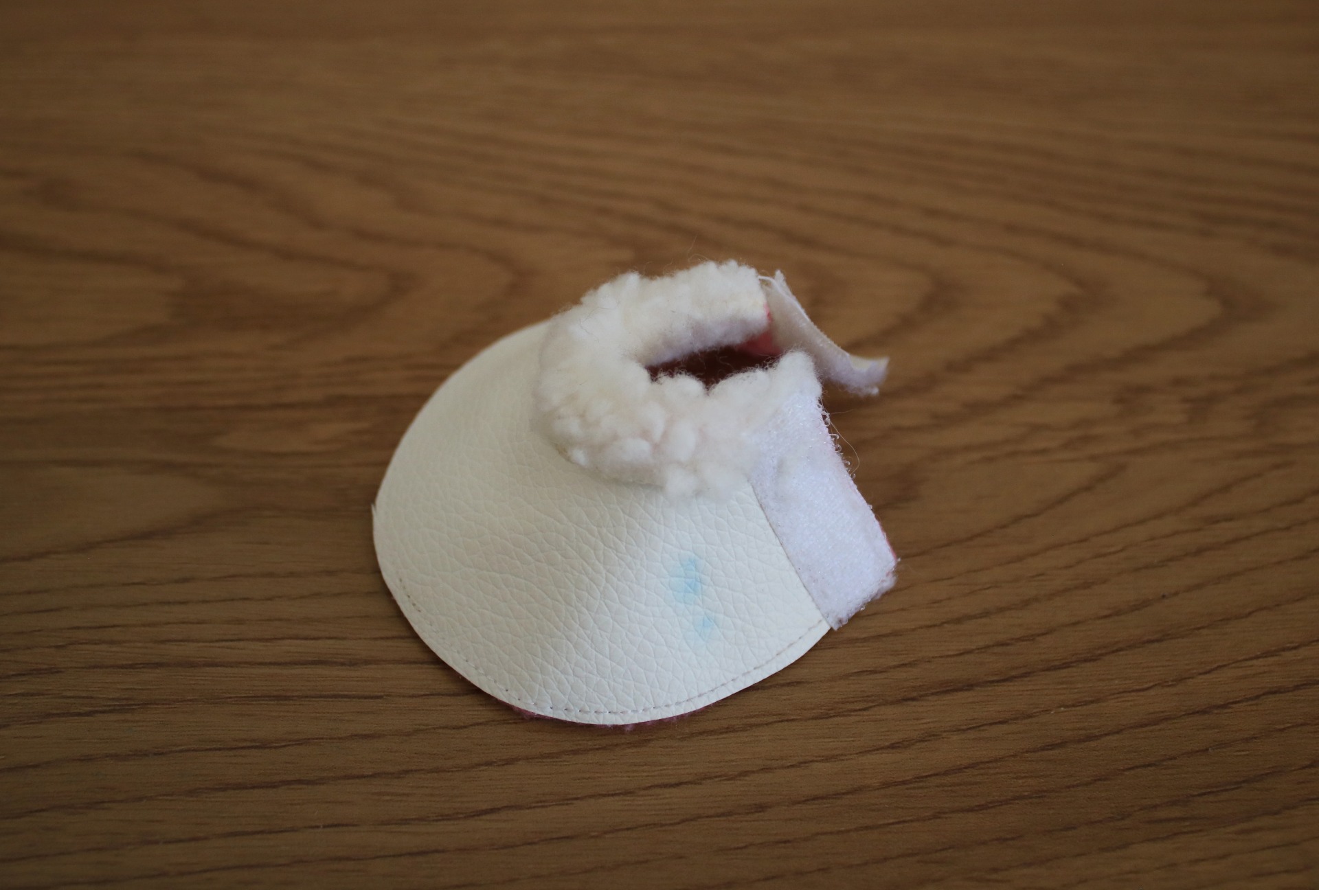 Outside is from white faux leather, with sheepskin padding, inside has pink fleece padding. Velcro attachment.
