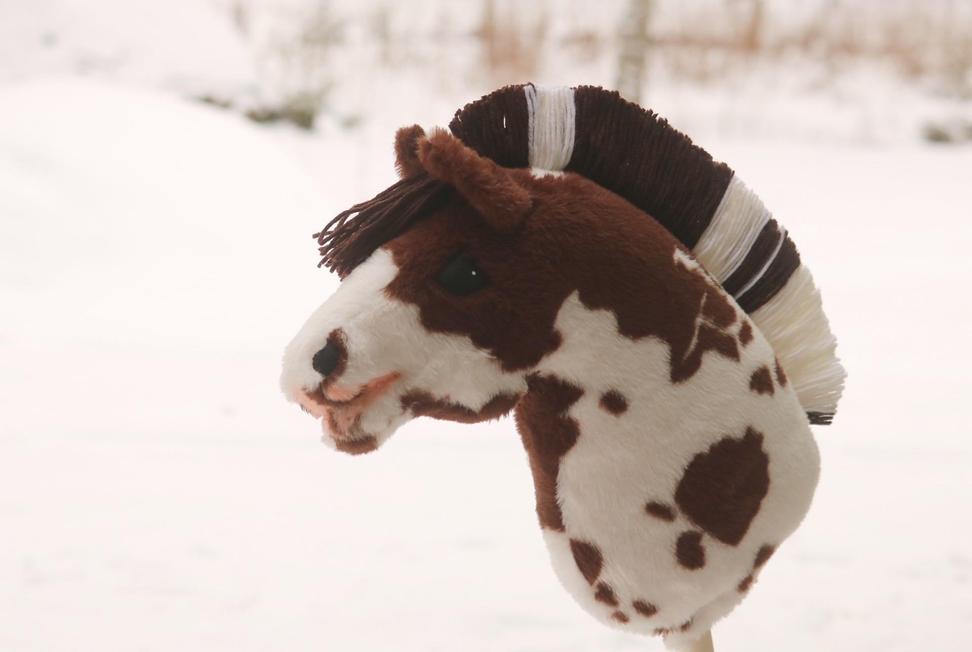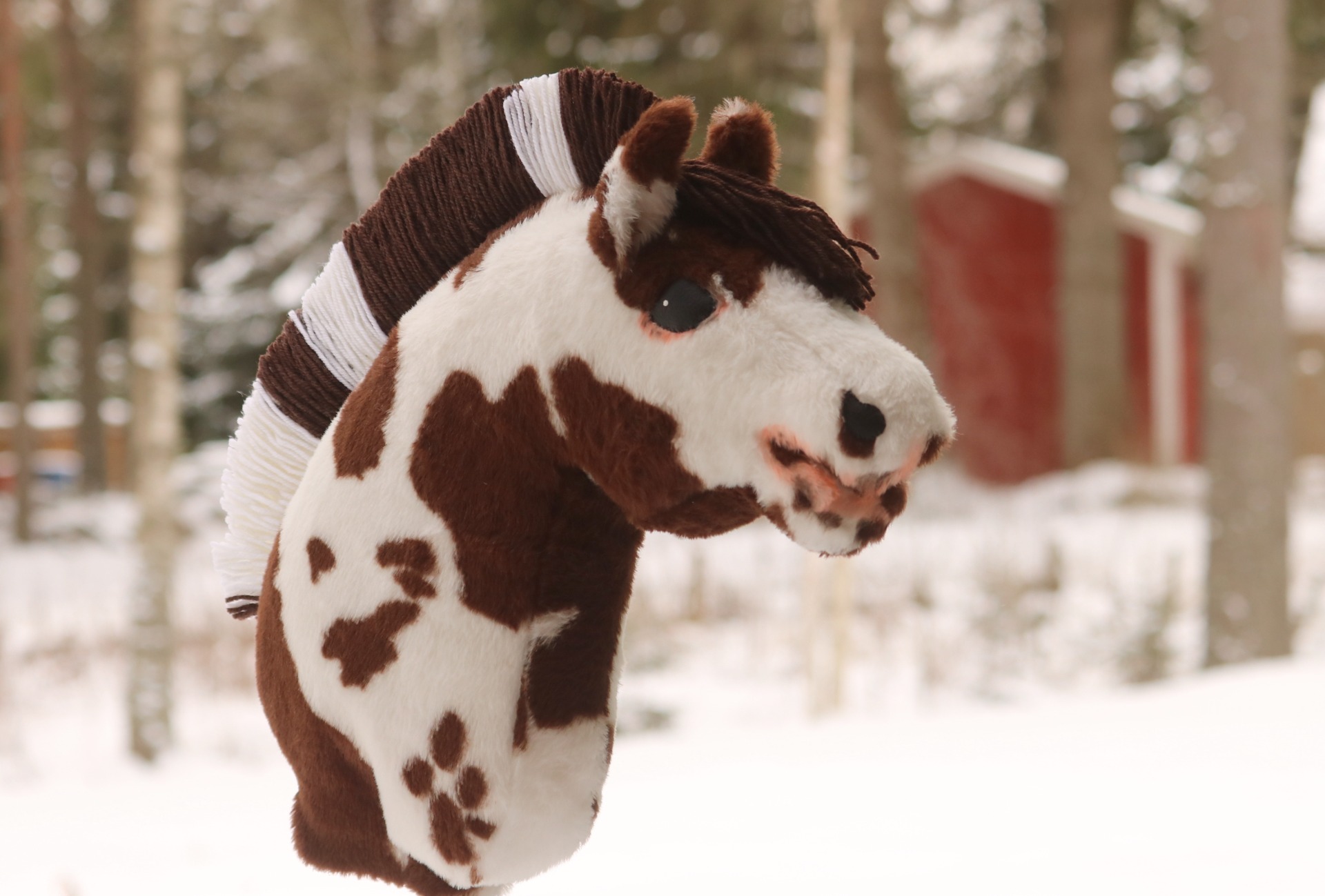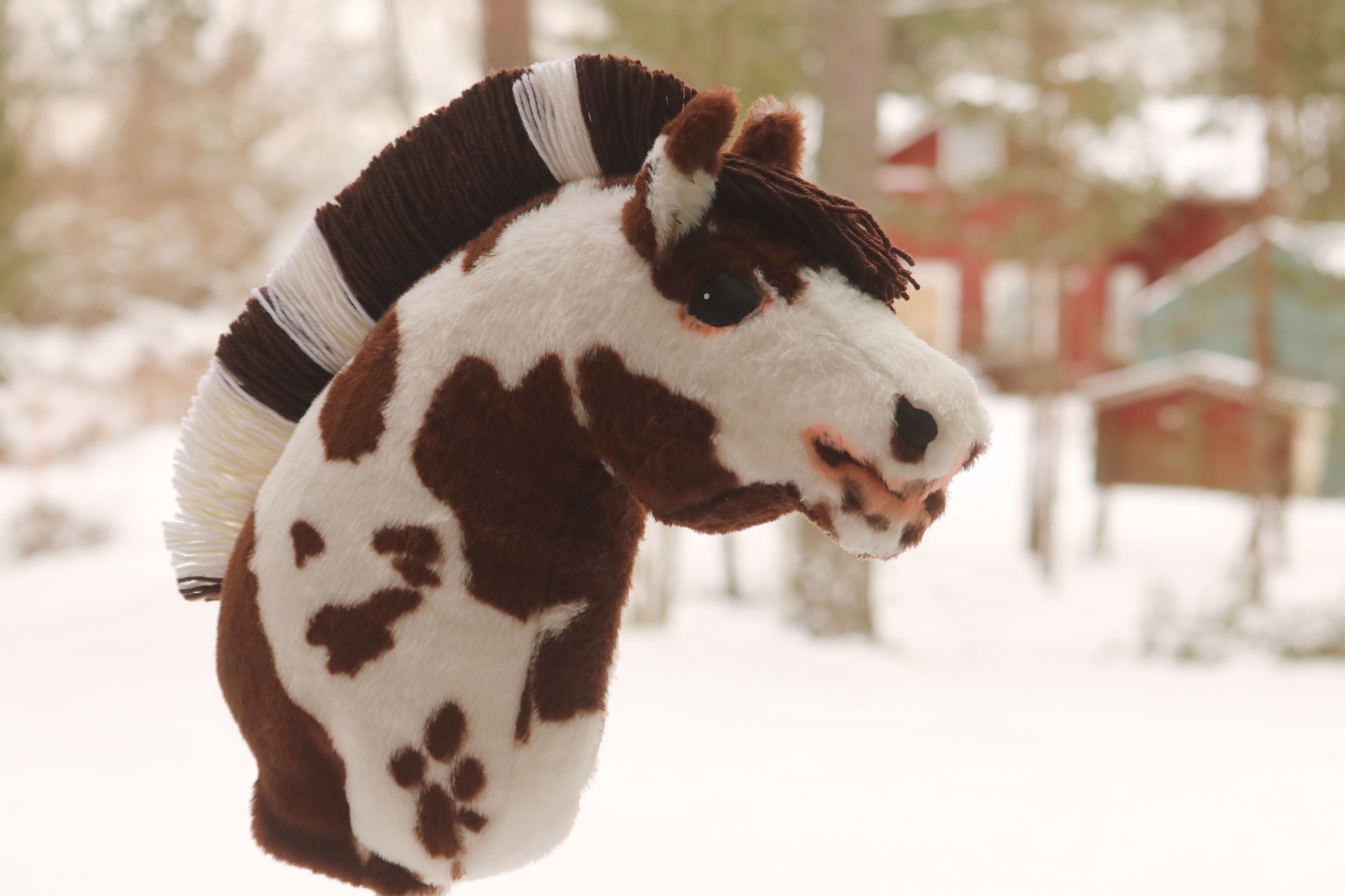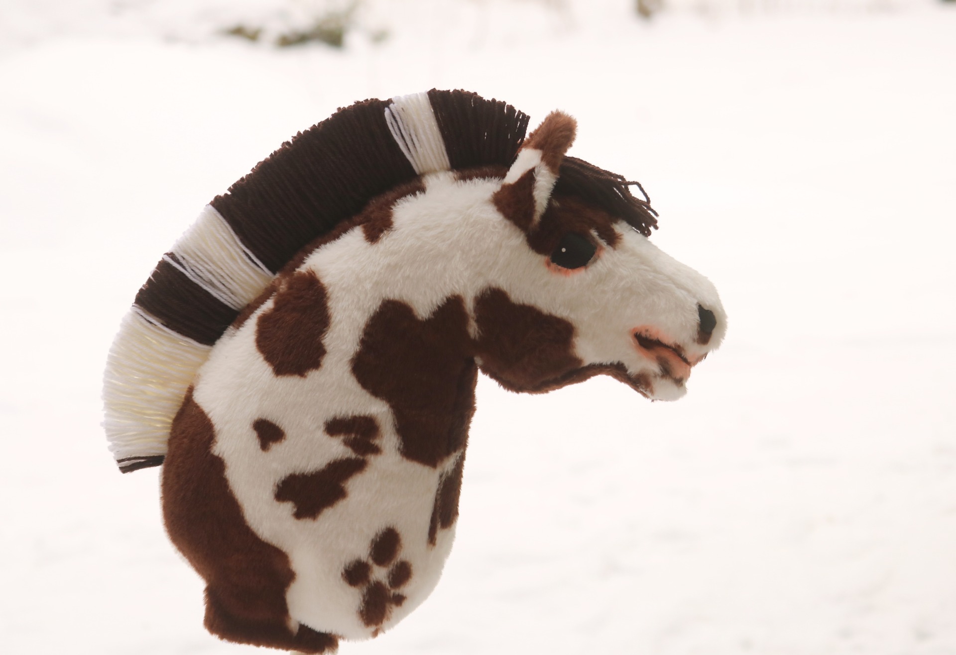 Made from brown pinto faux fur, with vlieseline. Dark brown-white standing mane out of wool blend yarn, coloring on the muzzle and around the right side's eye.