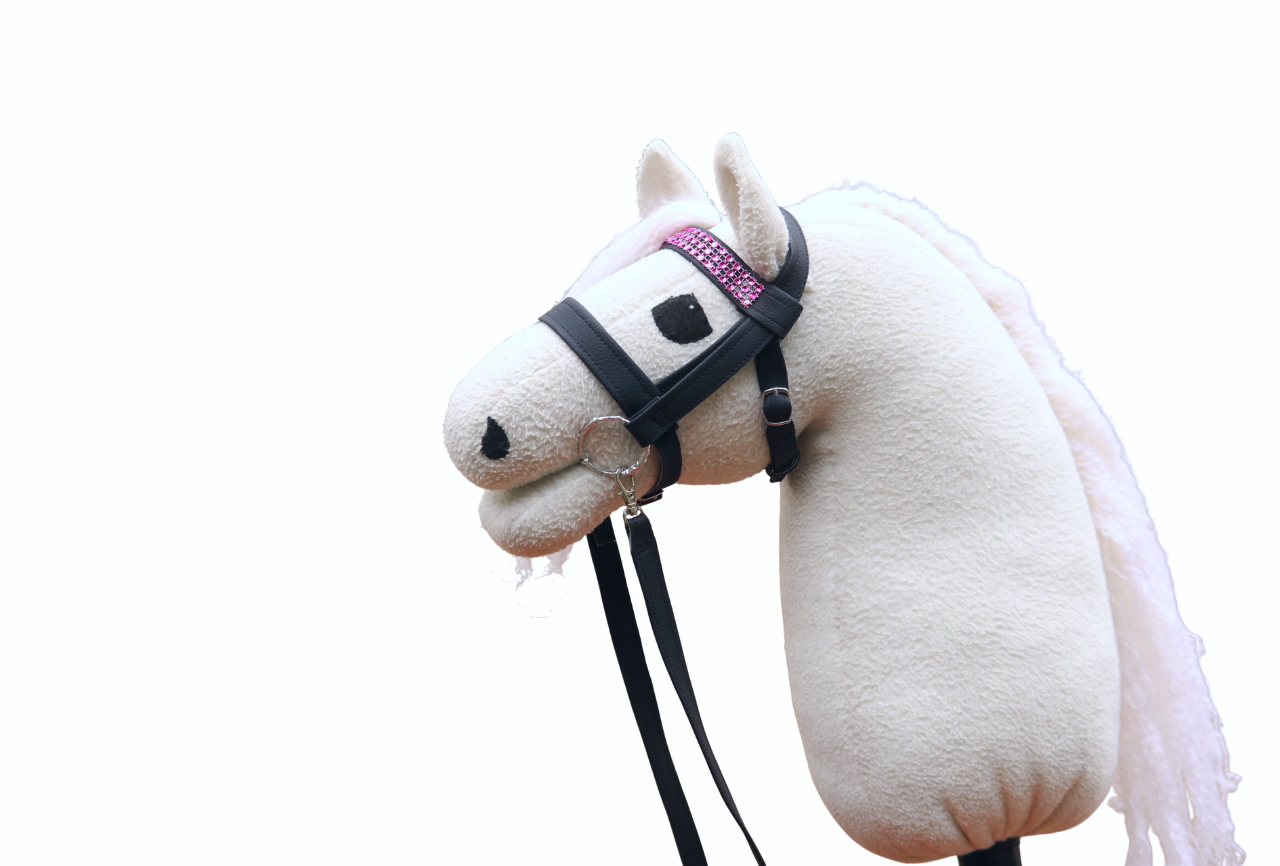 Tikatut englantilaiset suitset, eli suitset yhdellä turpahihnalla. Kolme riviä strassia. Kaksipuoleisesta, tikatusta keinonahasta. Irrotettavat ohjat ja lenkit solkien hihnoille.