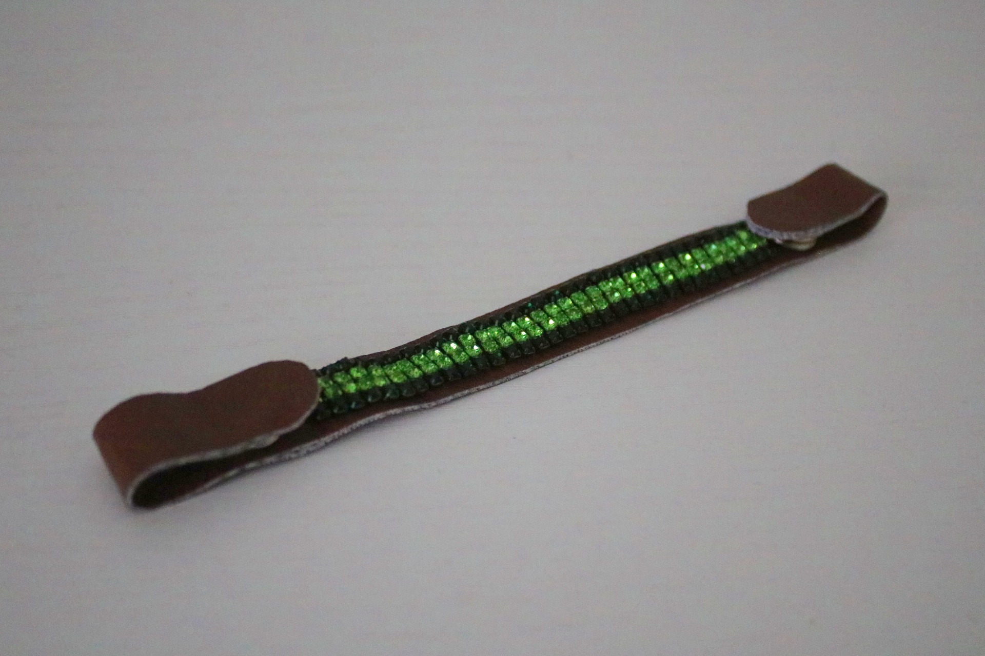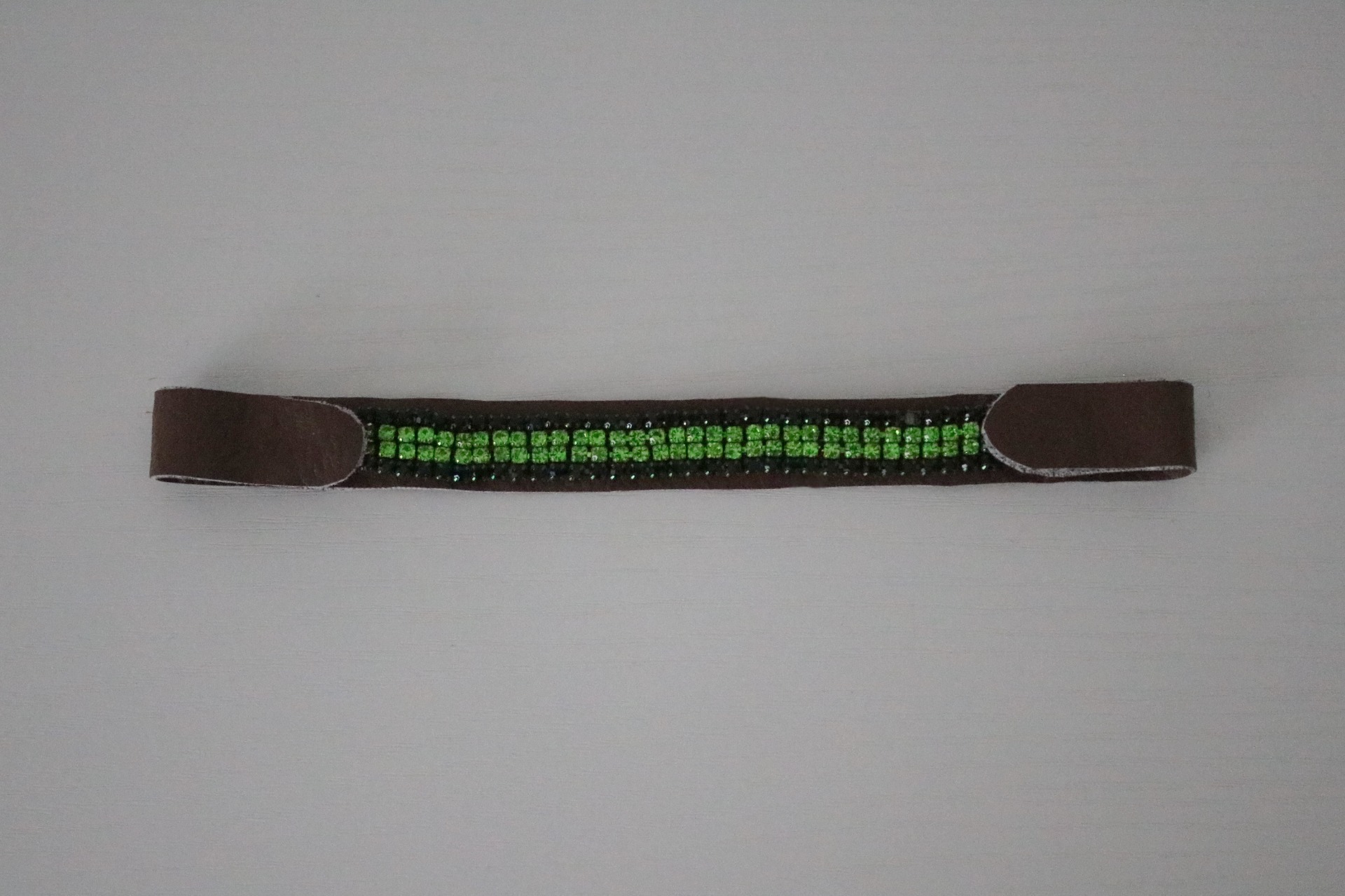 Rhinestone browband for a hobbyhorse bridle. The browband is reddish brown, double-sided faux leather and openable with snap buttons. With dark green and light green rhinestones.
