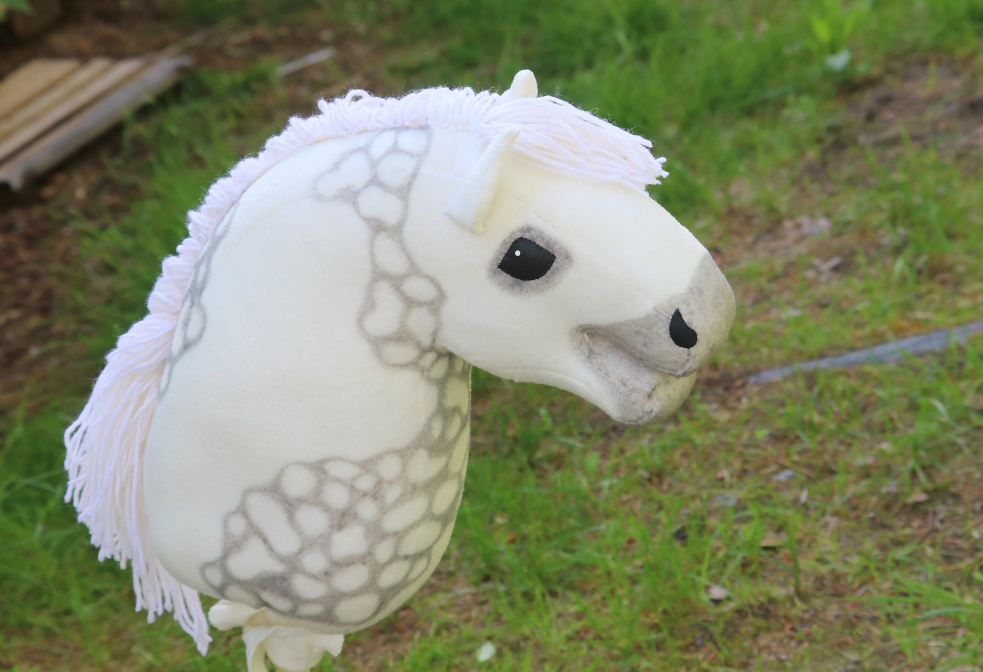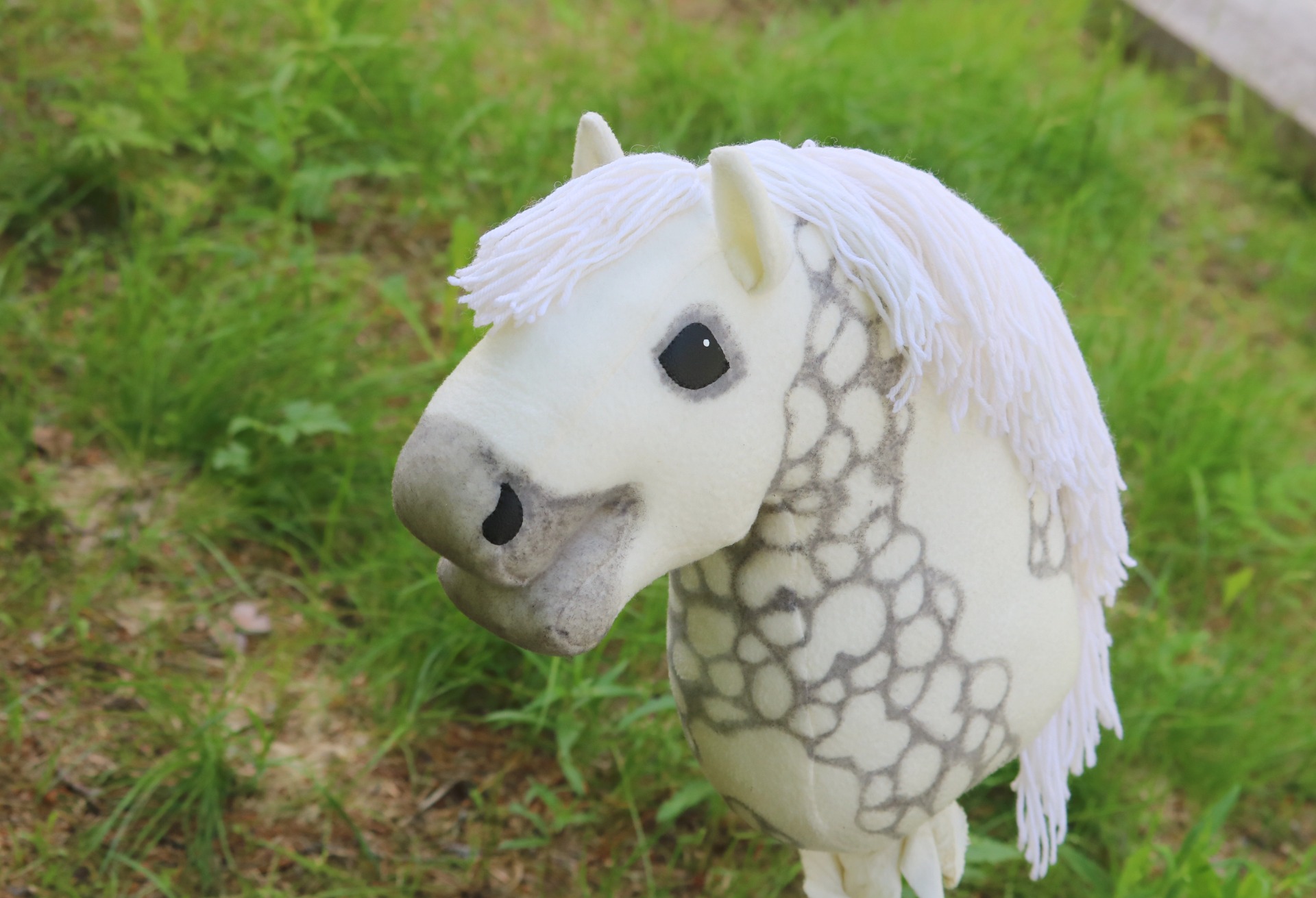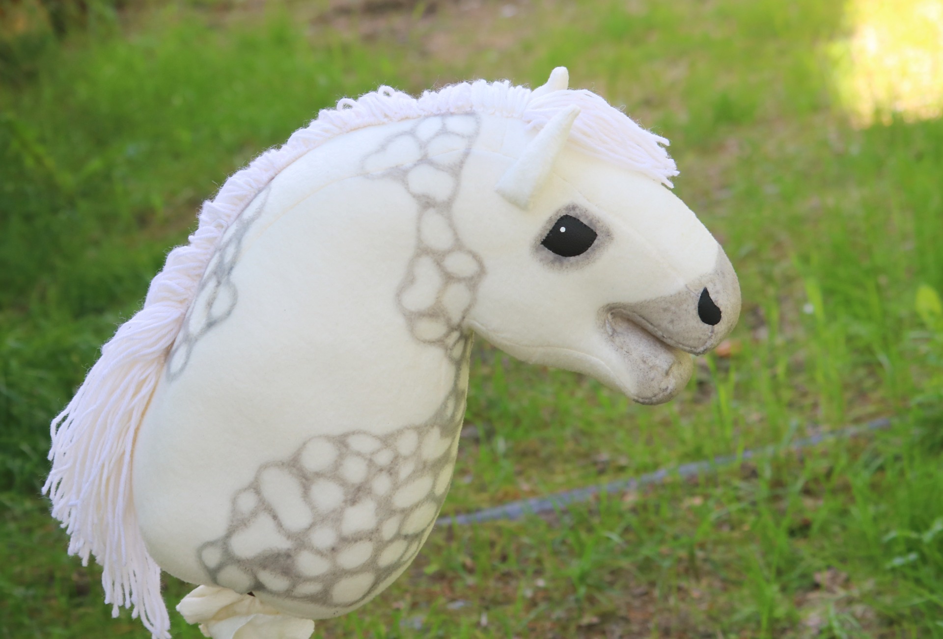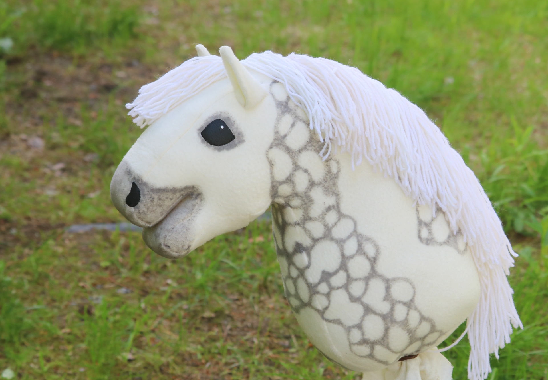 Valkoisesta fleecestä, valkoinen harja villasekoitelangasta. Osittainen papurikkokuviointi ja tummennokset.