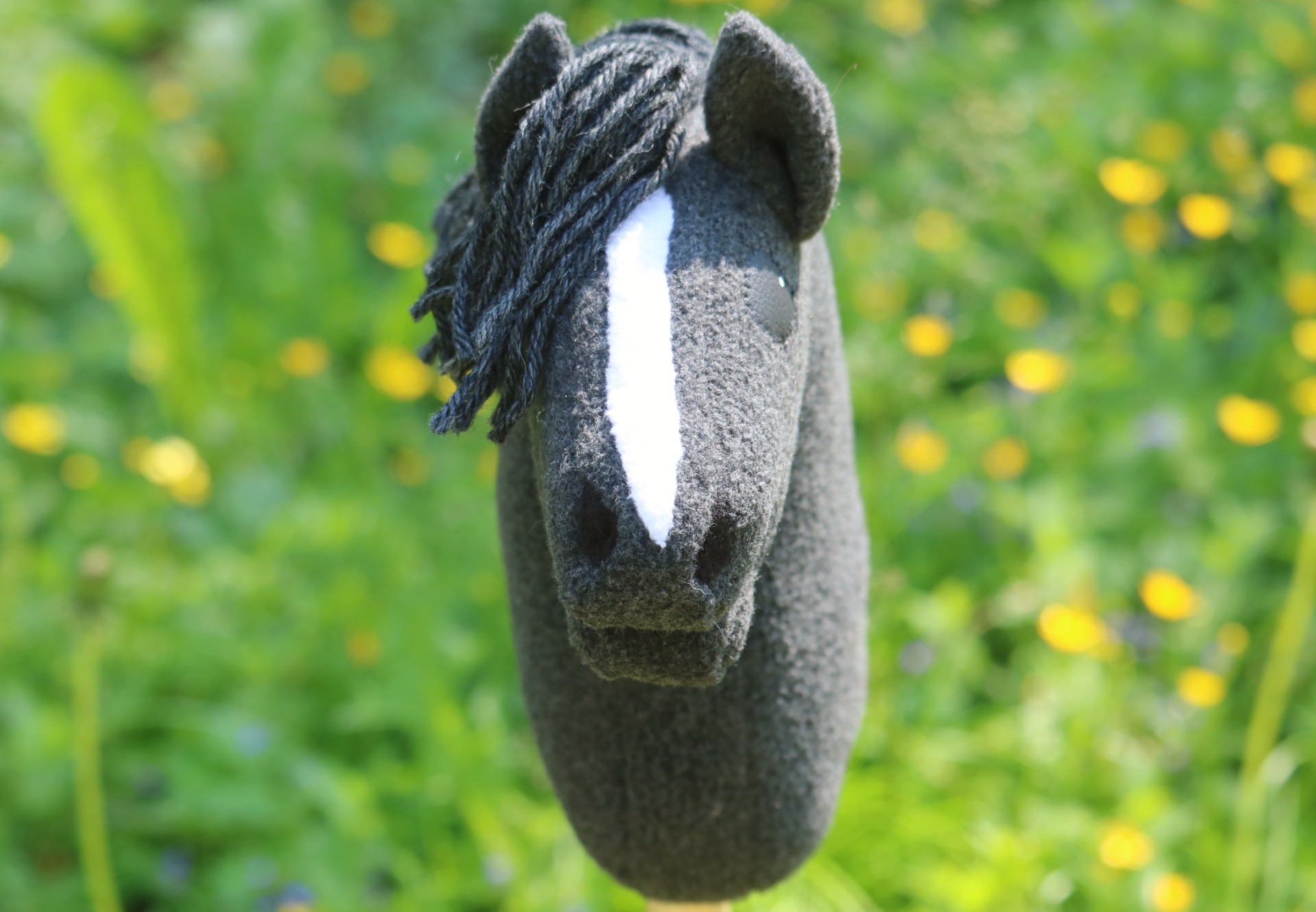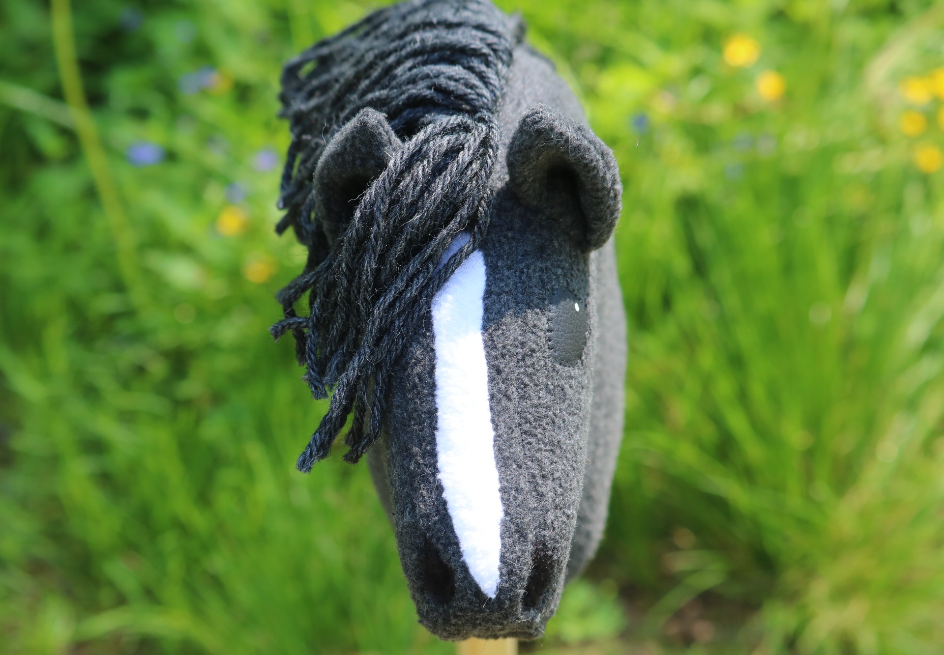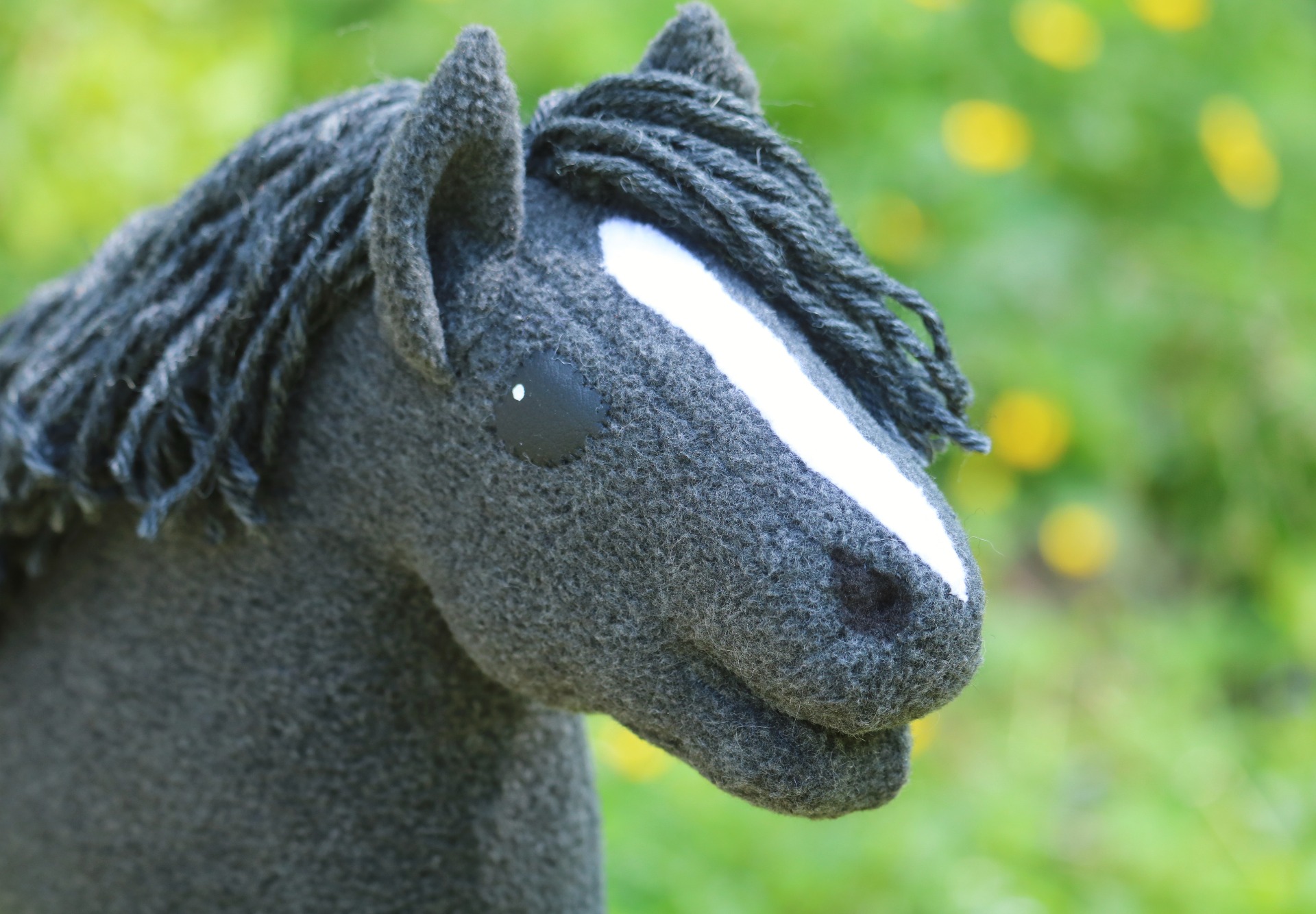 Tummanharmaasta fleecestä, piirrolla, tummanharmaa harja villasekoitelangasta.