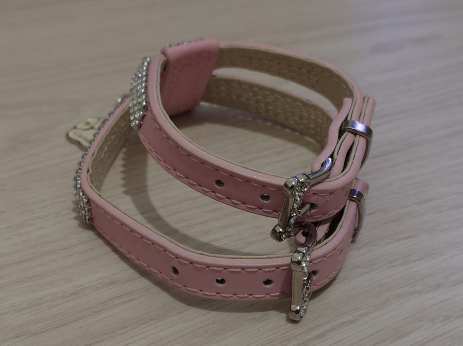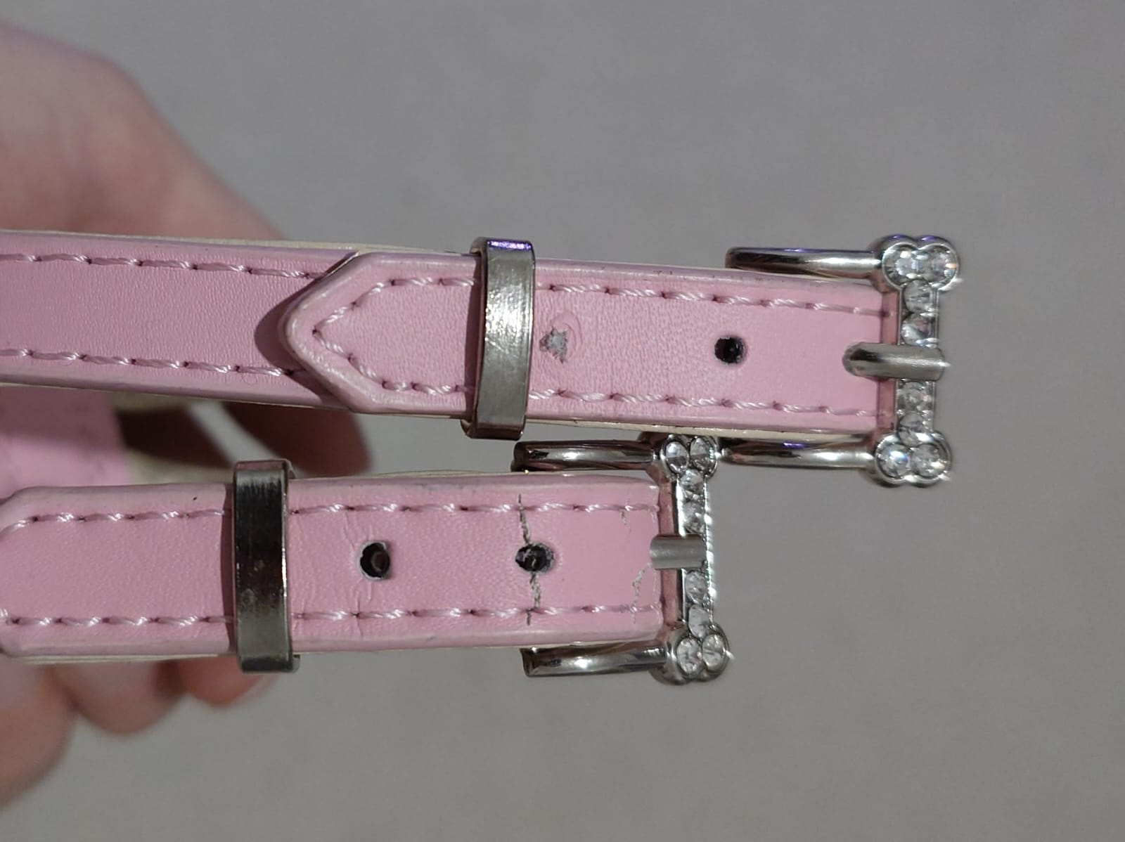Pidempään hihnaan tehty lisäreikä, toisessa hihnassa vaaleanpunaisen nahan pinnassa pientä halkeamaa. Muutaman kerran käytetty.