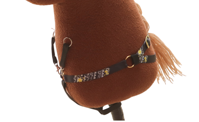 Y-martingaali nauhasta, irrotettavilla martingaaliosilla. Kaulanympärys avattava ja säädettävissä soljella.