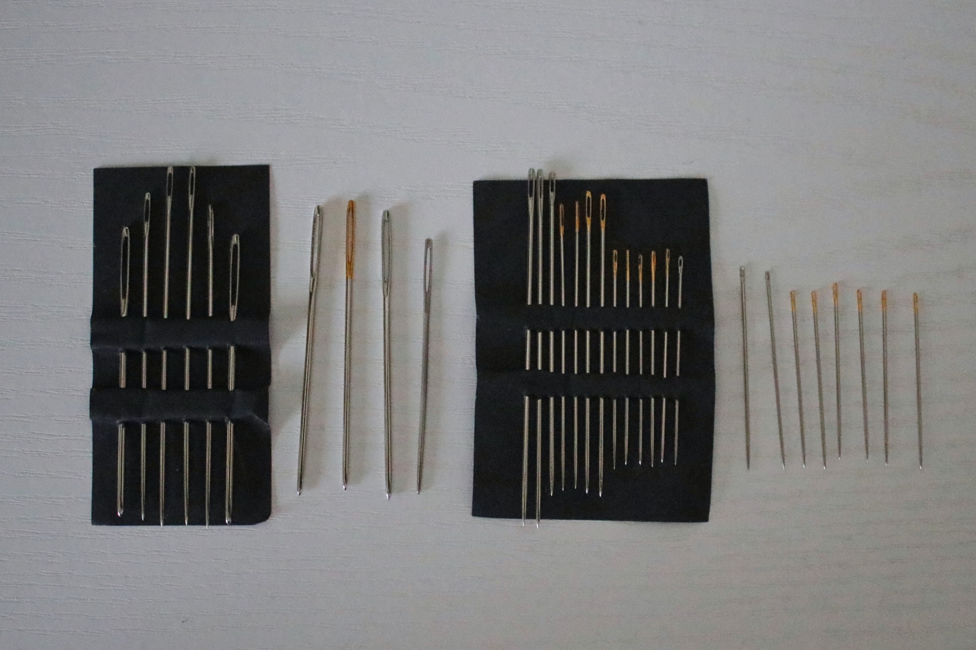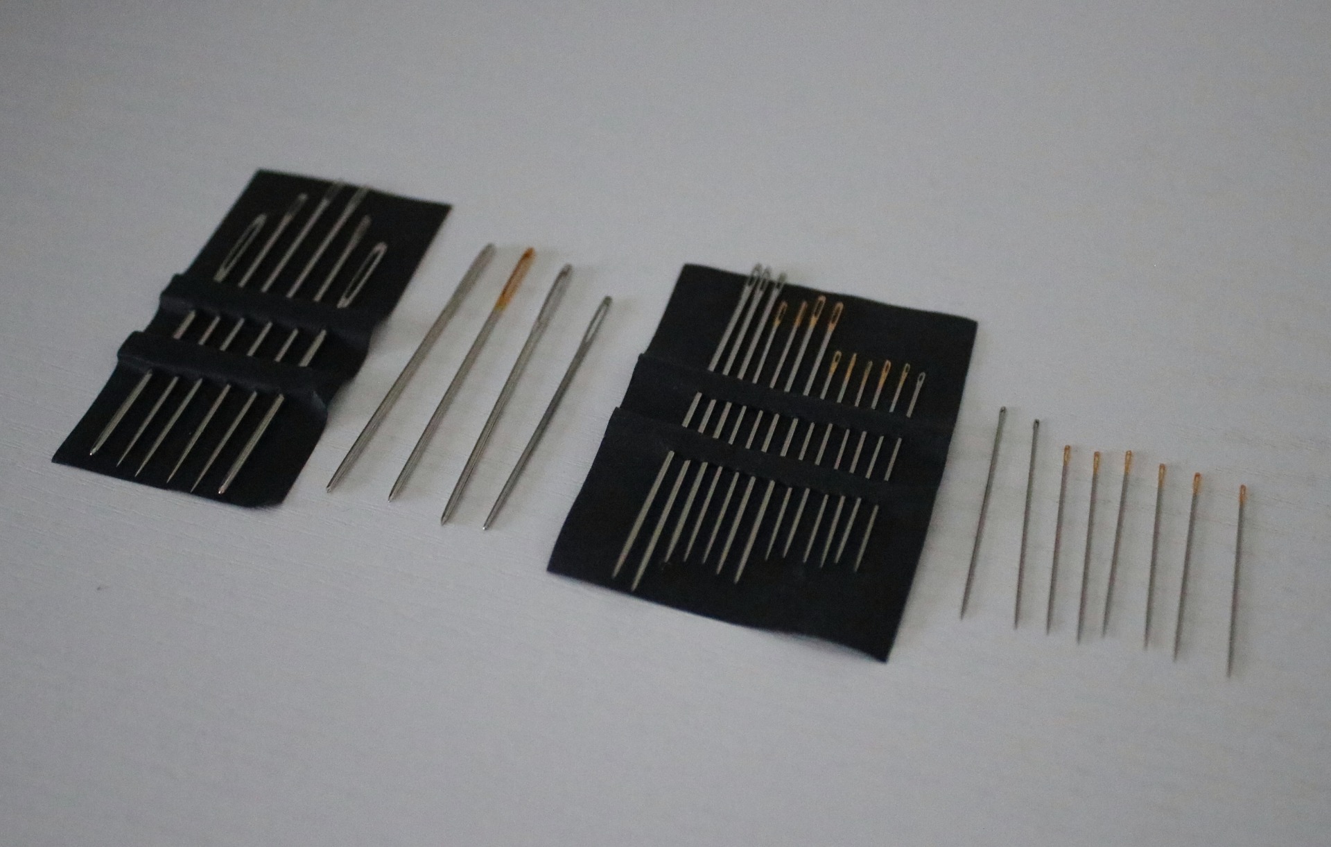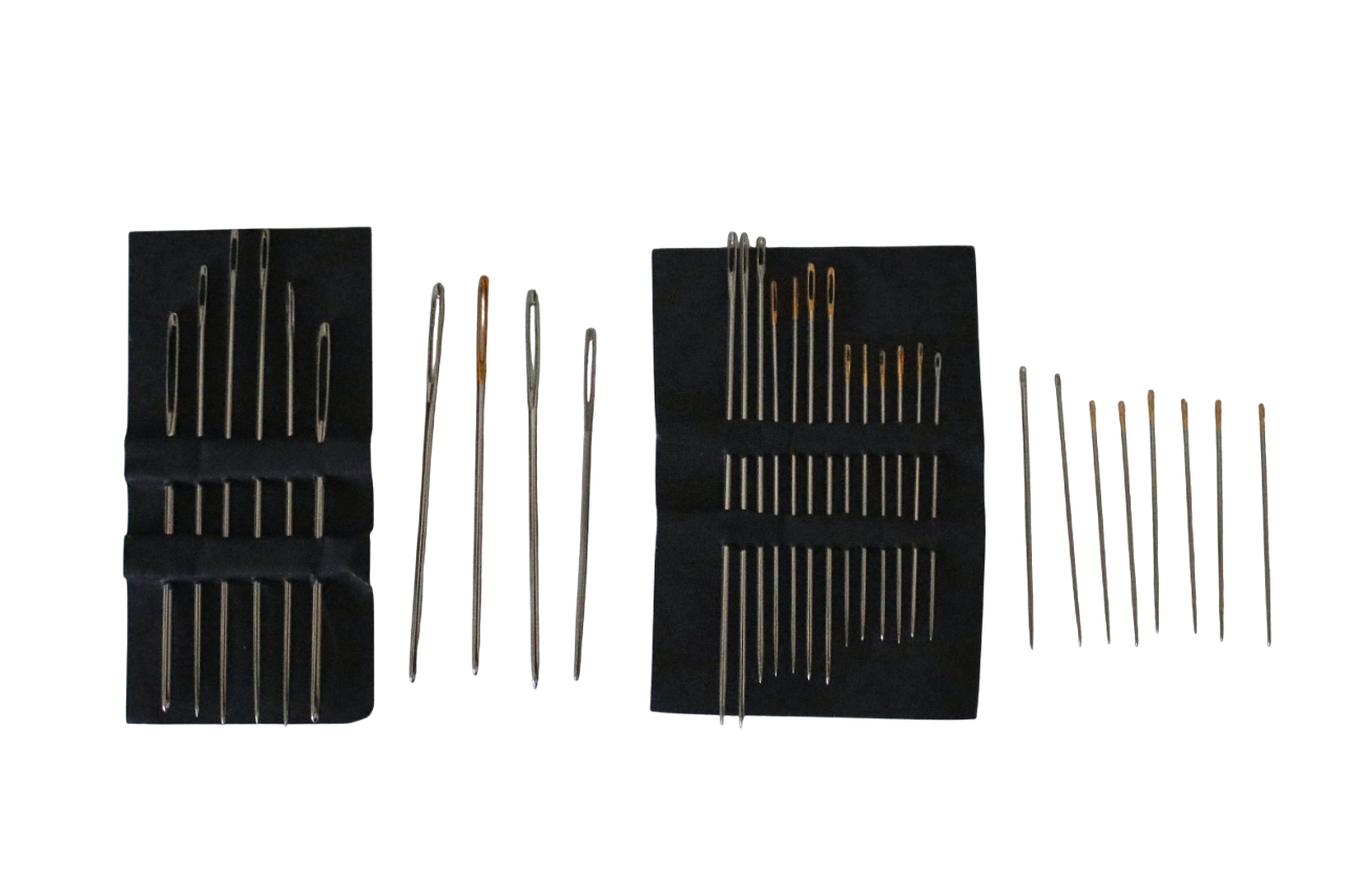 Ompeluneulat, joko settinä 31 kpl (kaikki kuvassa olevat) tai yksittäin. Eri kokoja 3-6 cm (katso vaihtoehdot). Suurin osa teräväpäisiä (pieni silmäkoko), muutama tylppä (suurempi silmäkoko).