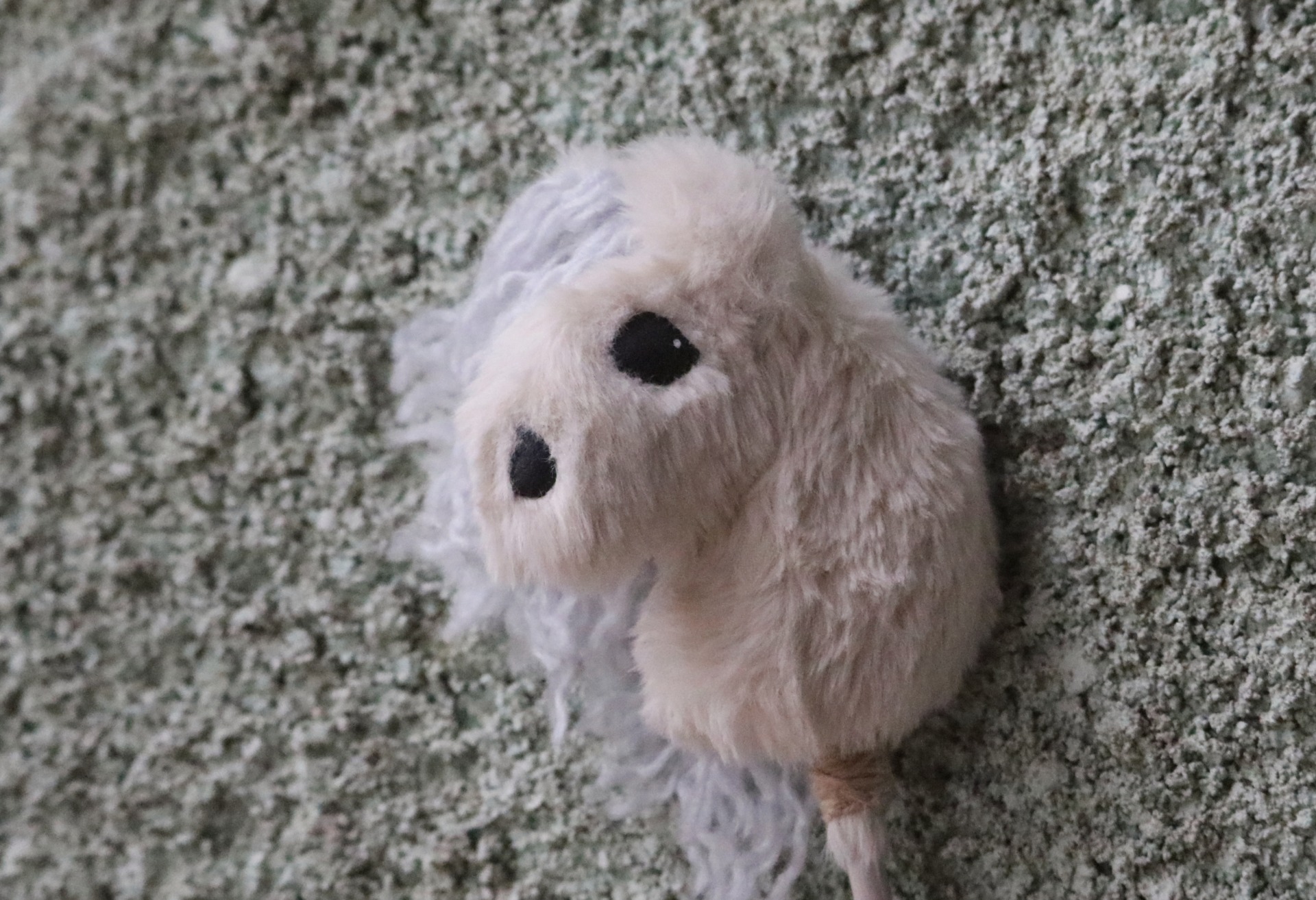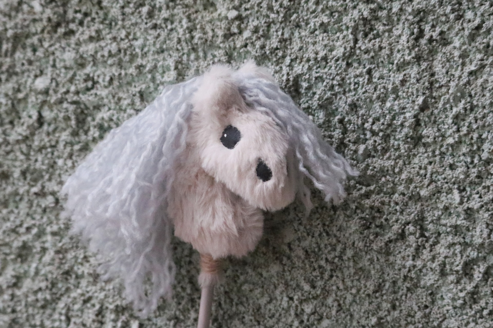 Made out of light colored faux fur, light grey opened, curly mane from Mohair -type yarn.