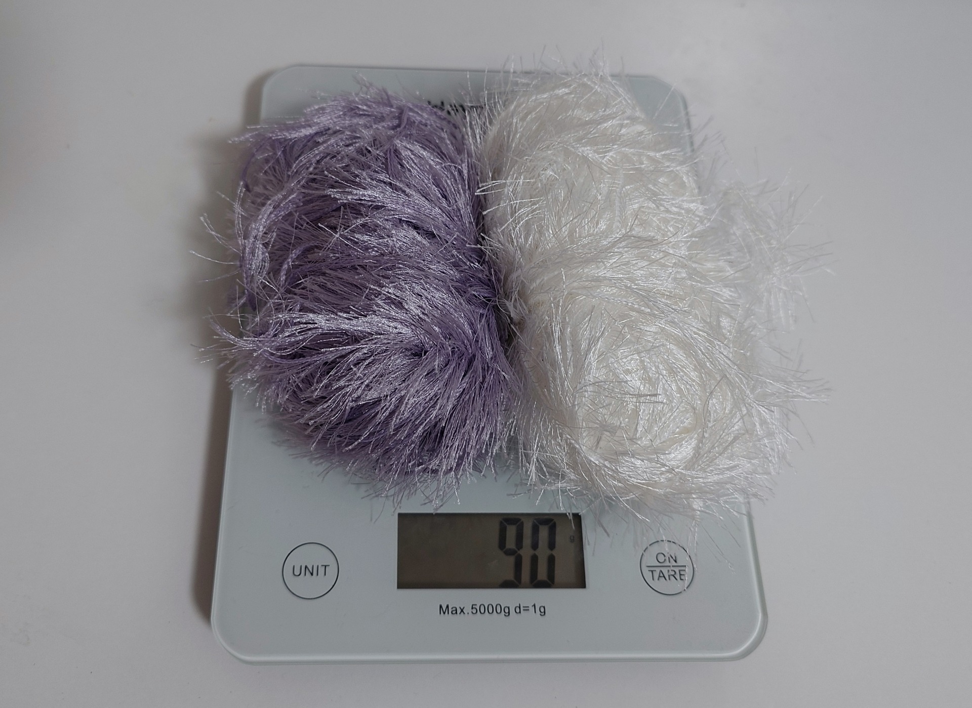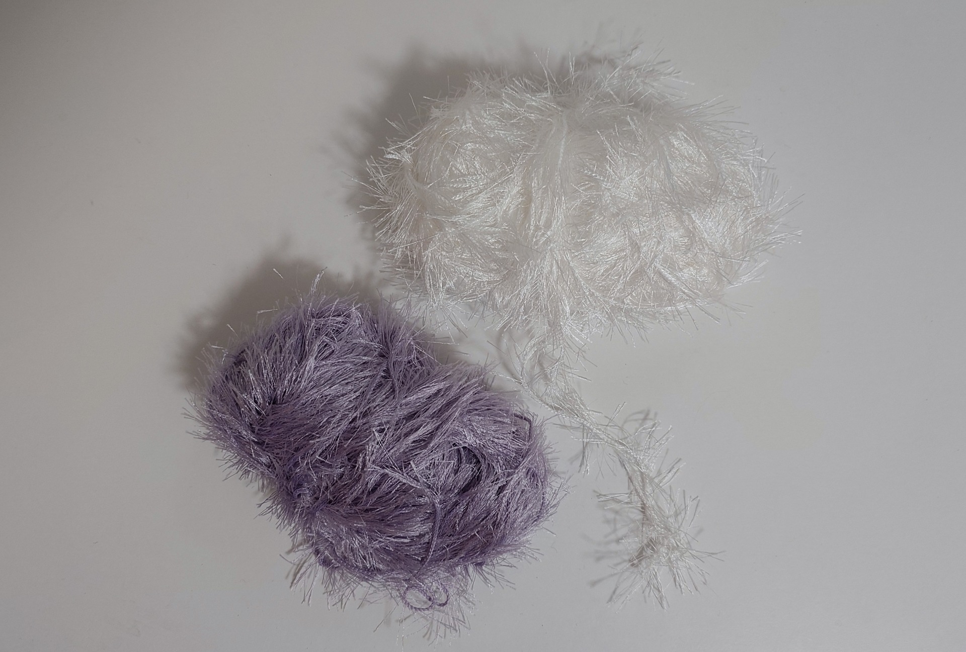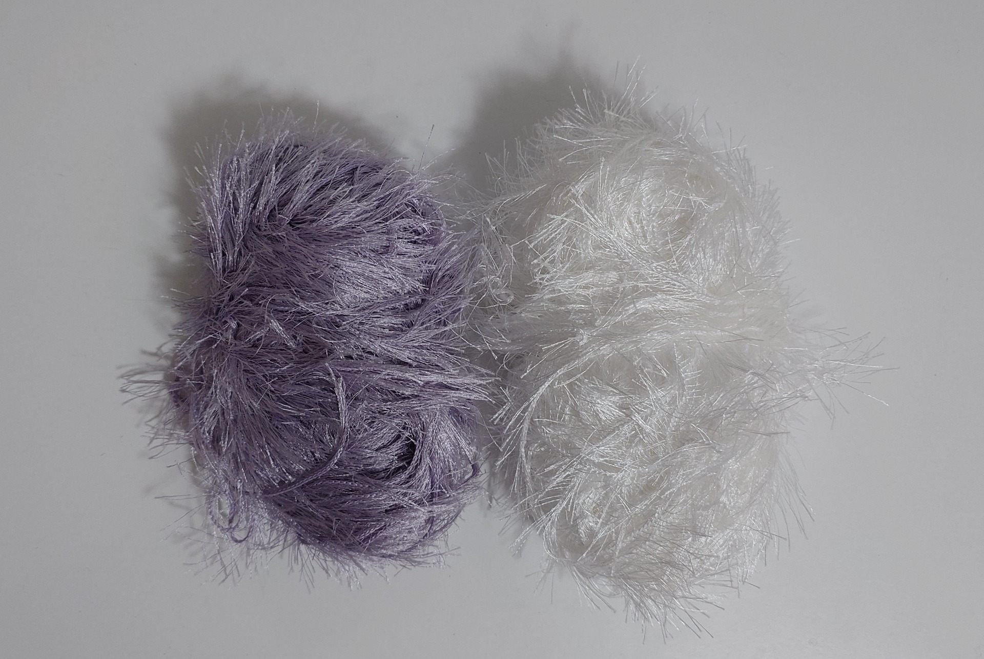 Kaksi kerää oletettavasti Schachenmayr Brazilia lankoja. Kumpikin kerä noin 45 g. Valkoinen ja lila.