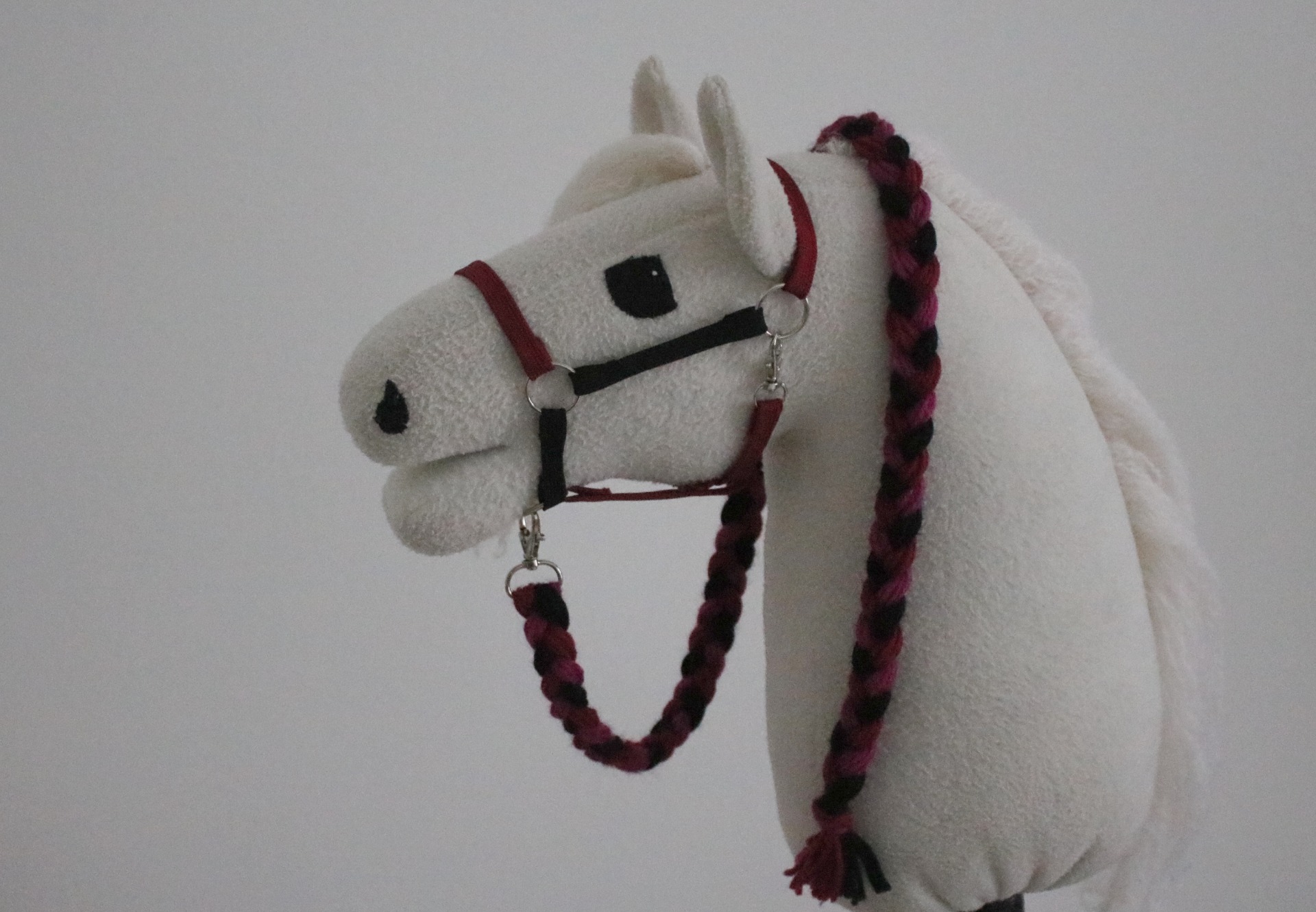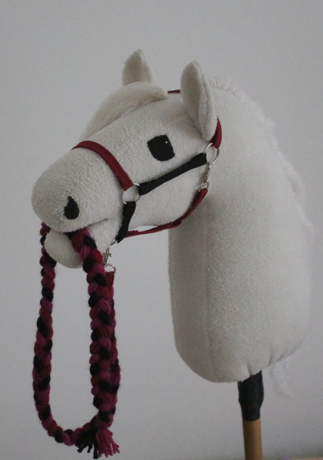 Tummanpuna-pinkki-musta letitetty riimunnaru langasta, pituus noin 100 cm.