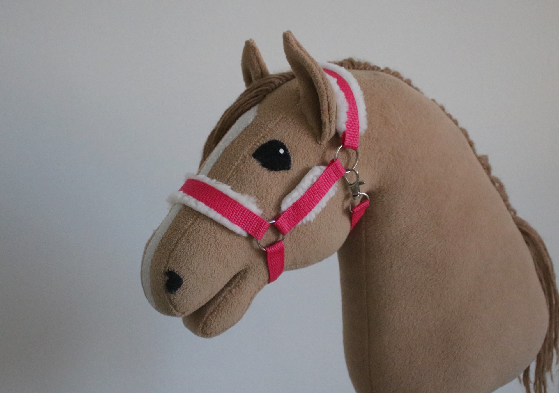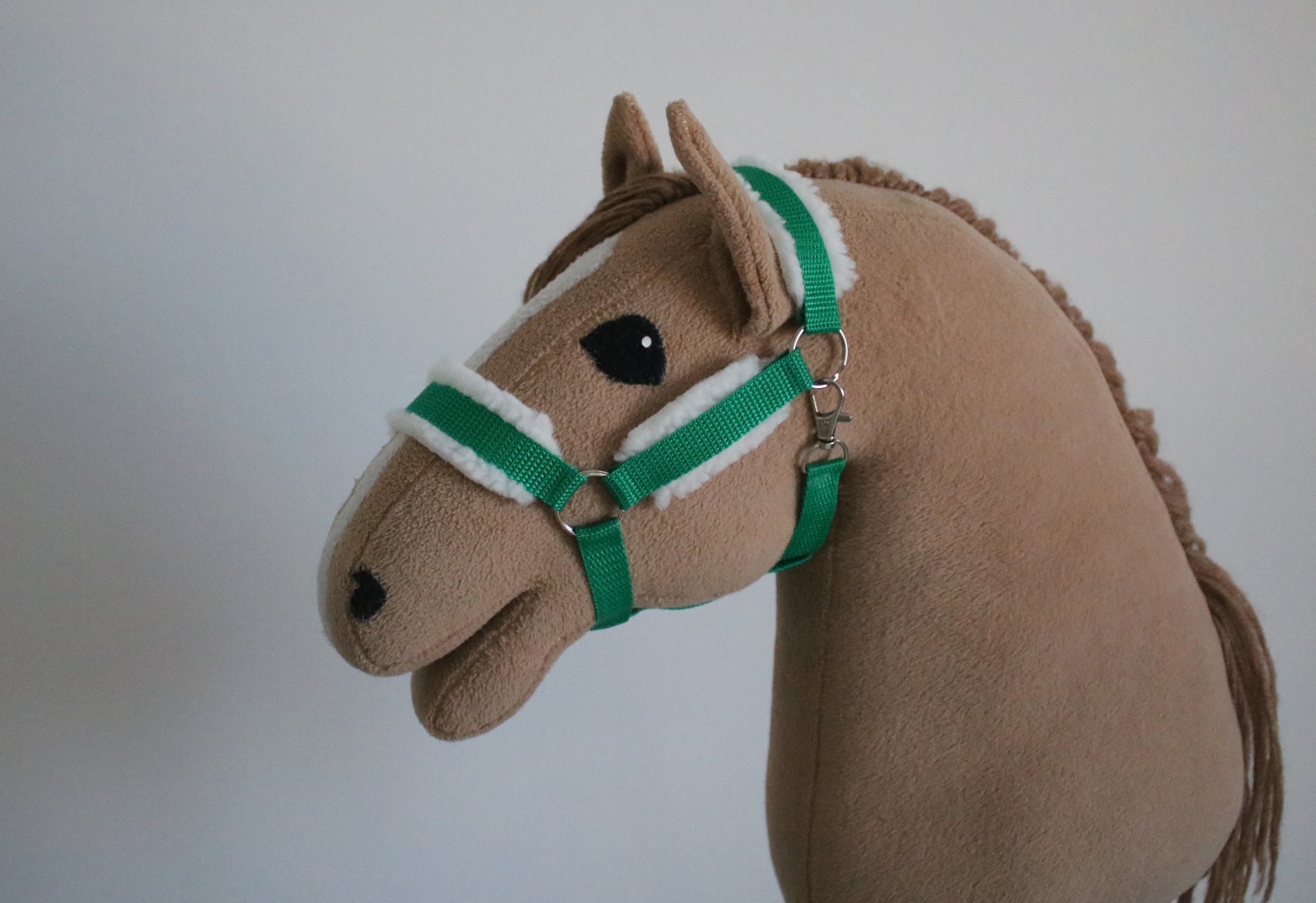 Riimu nylonnauhasta. Riimussa on viisi rinkulaa ja lukkokiinitys. Riimussa on lampaankarvapehmusteet turvalla, niskassa ja poskihihnoissa.