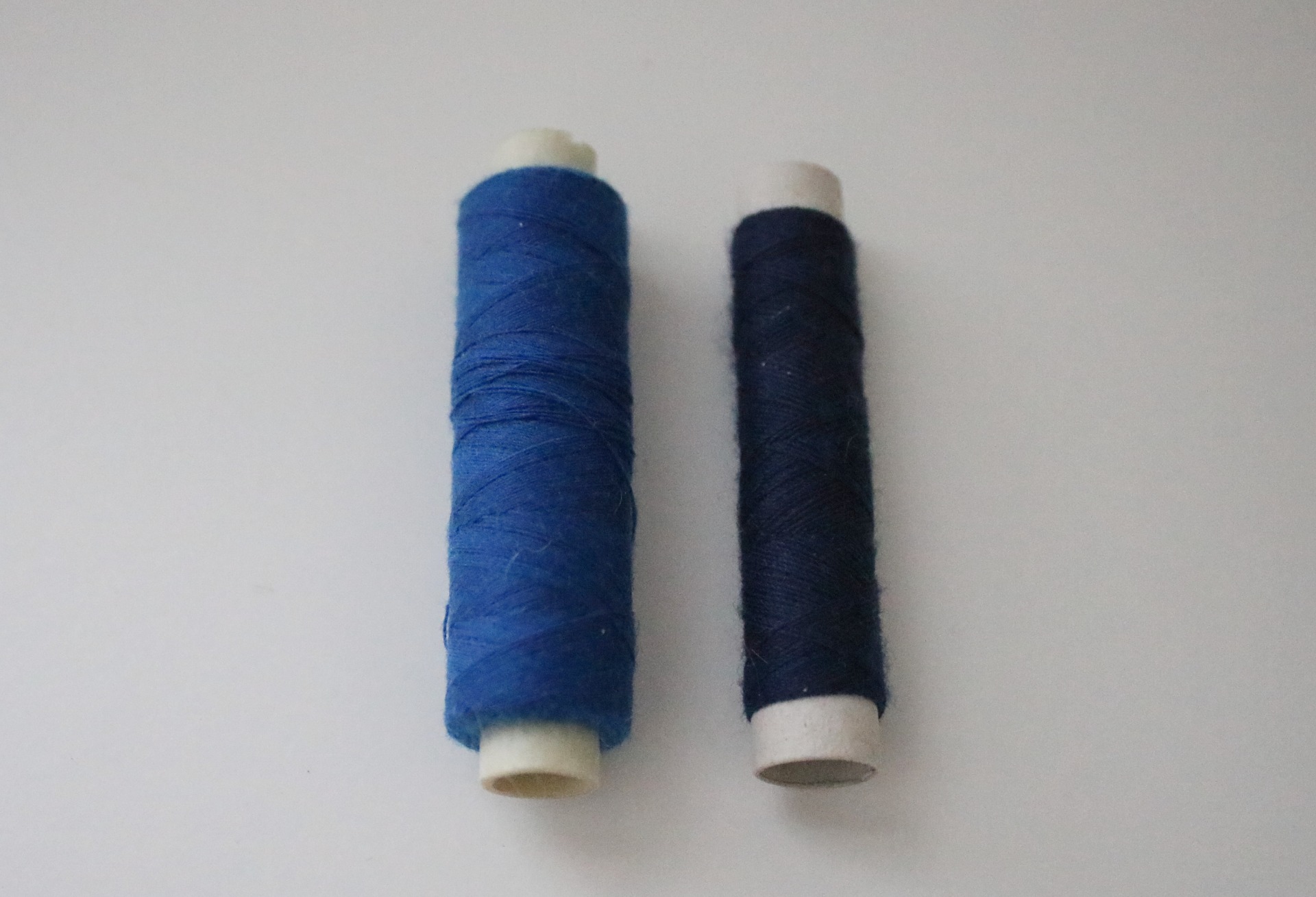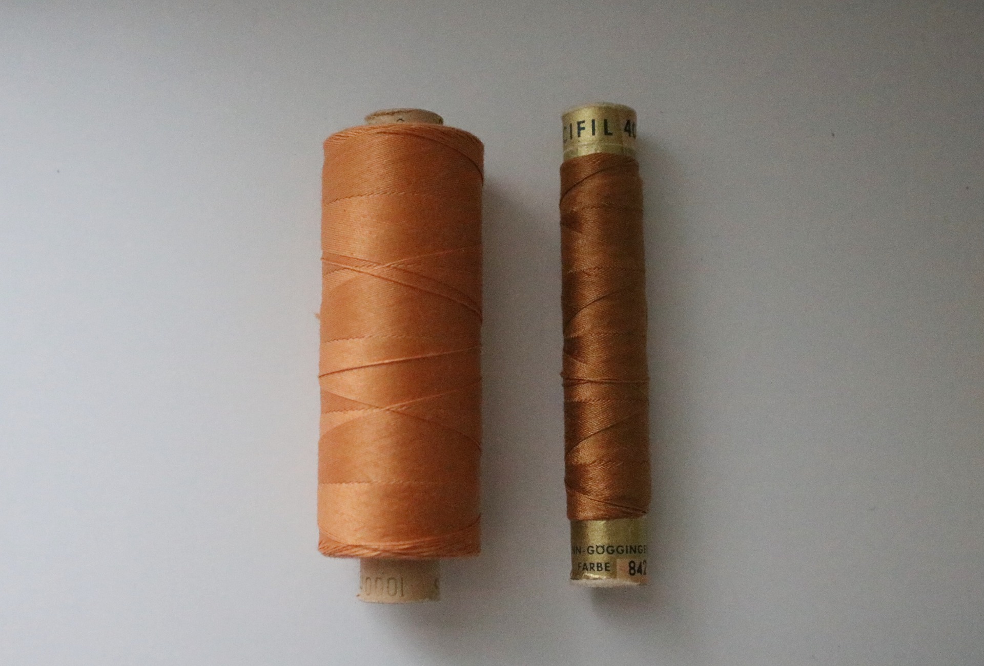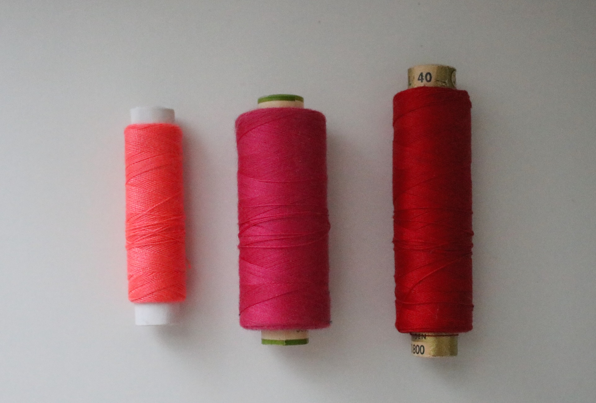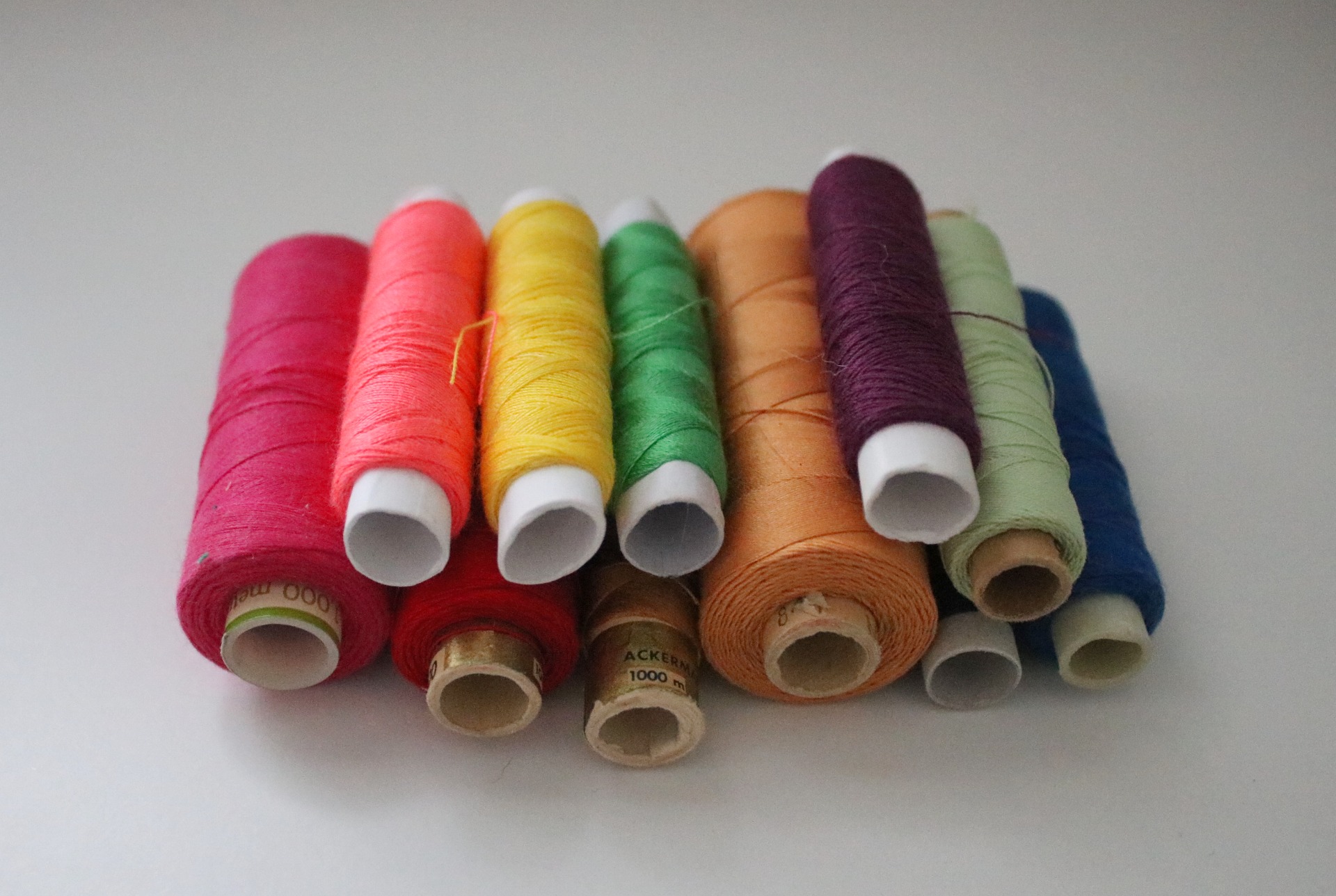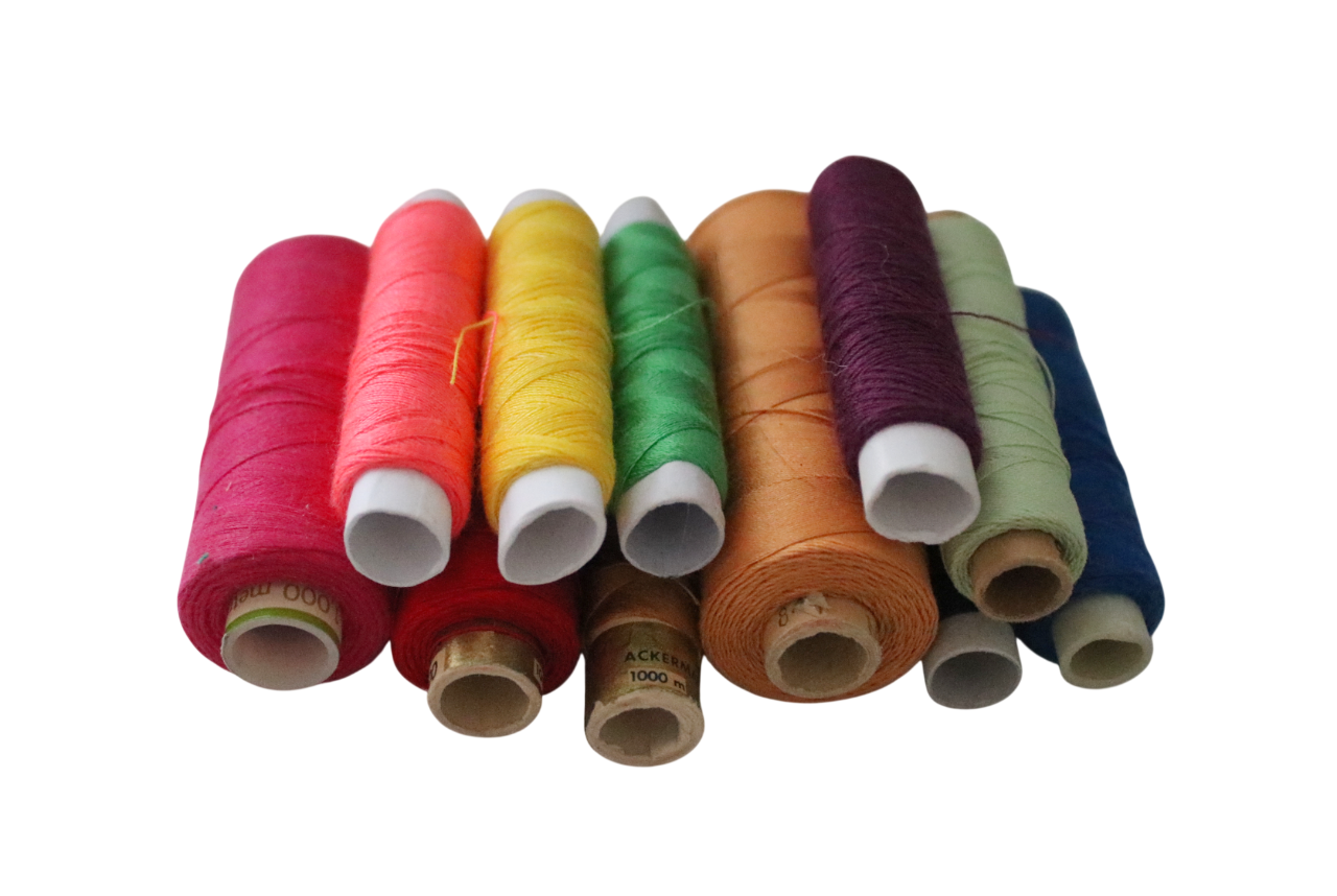Different colors and sizes of sewing thread spools.