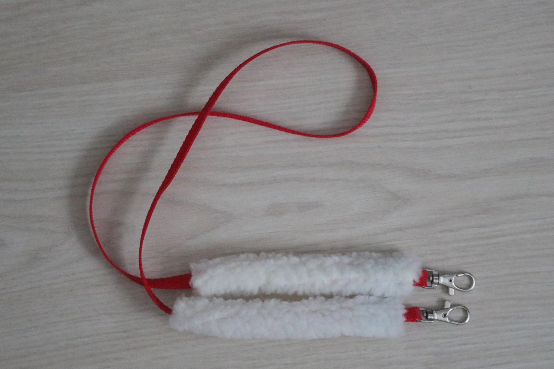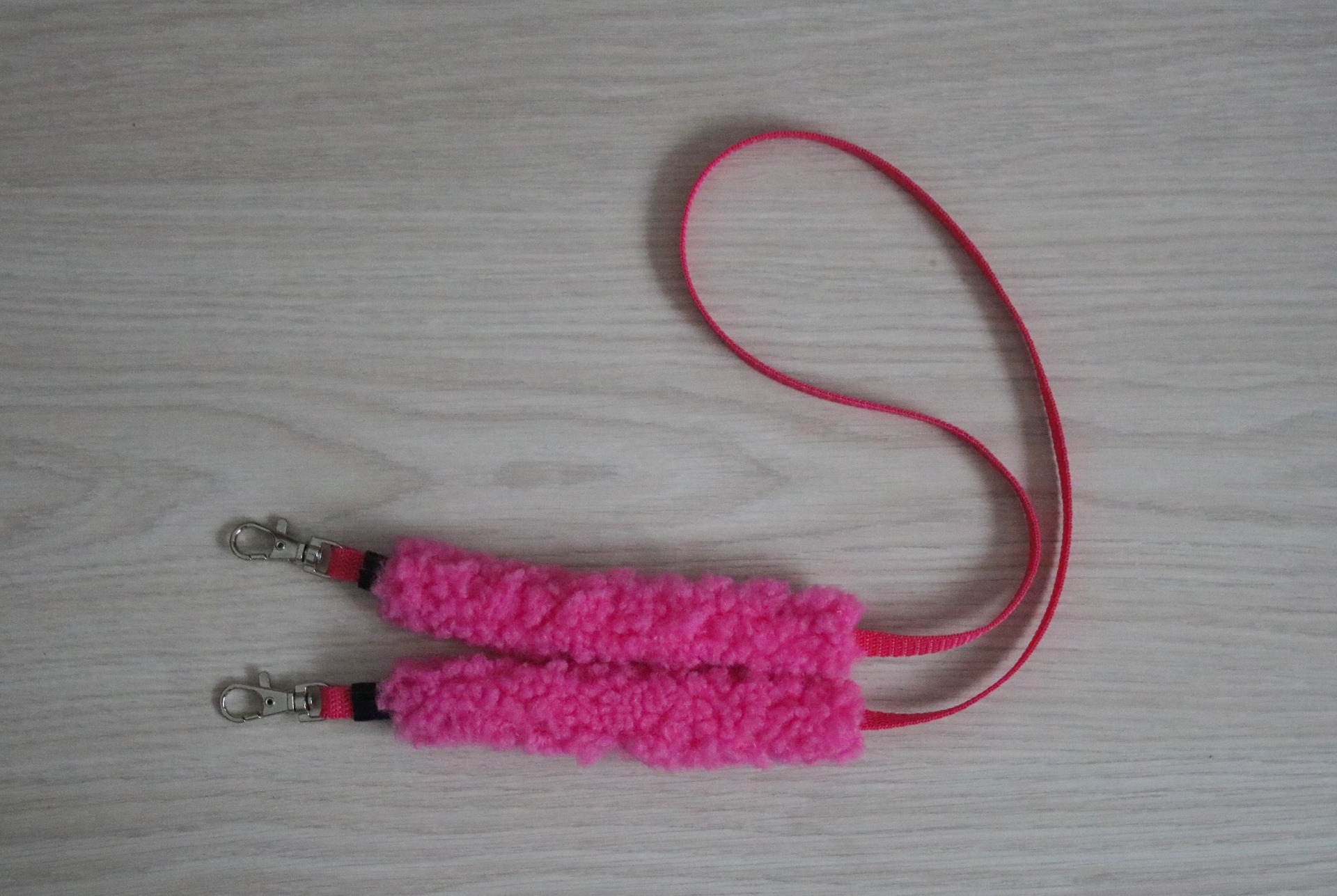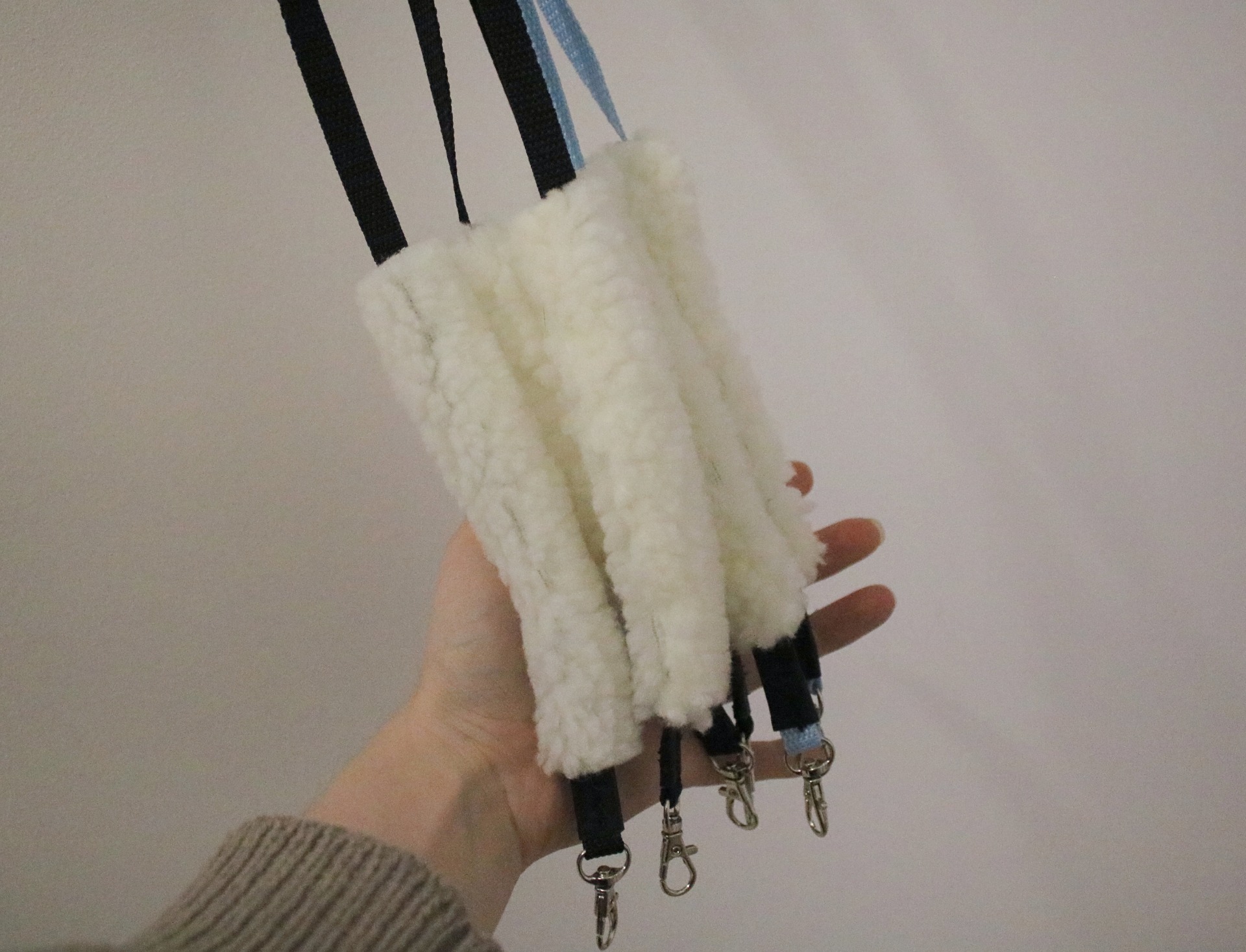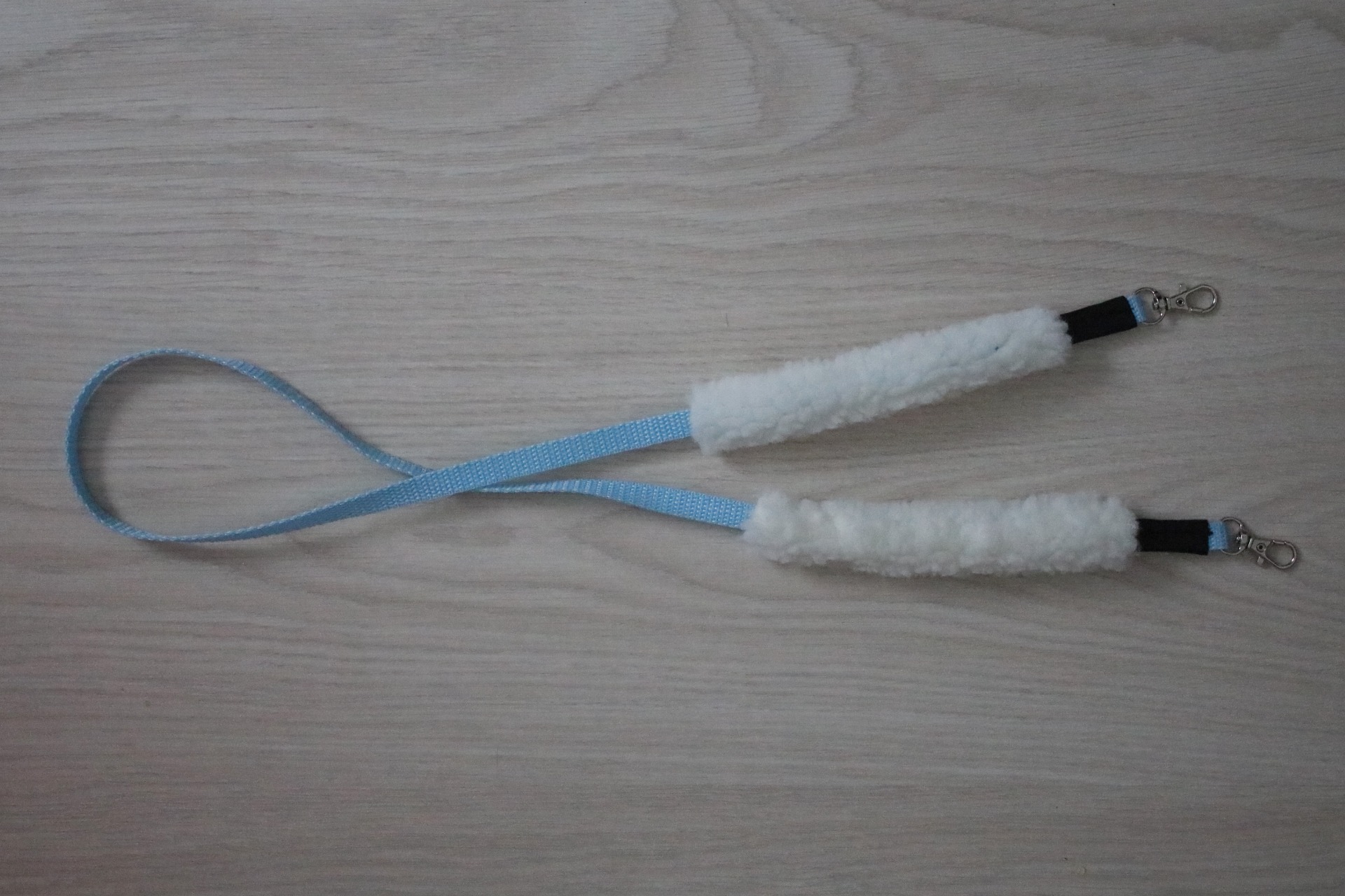 Nylon reins with a clasp attachment. Clasp attachment has faux leather finishing. Reins have movable sheepskin padding on both sides (length about 15 cm).