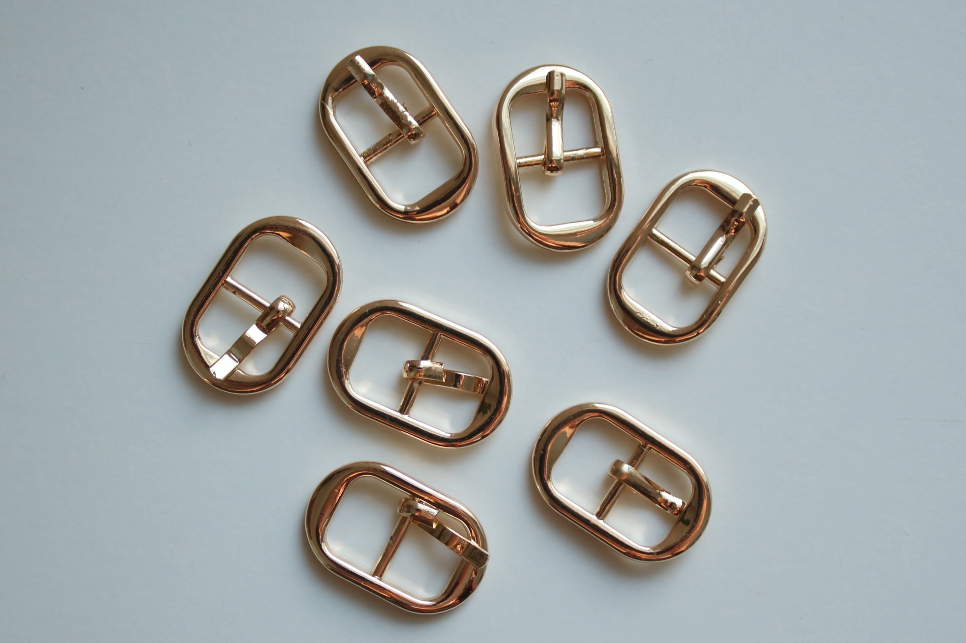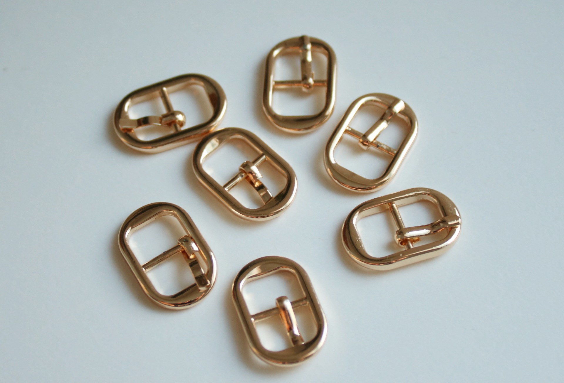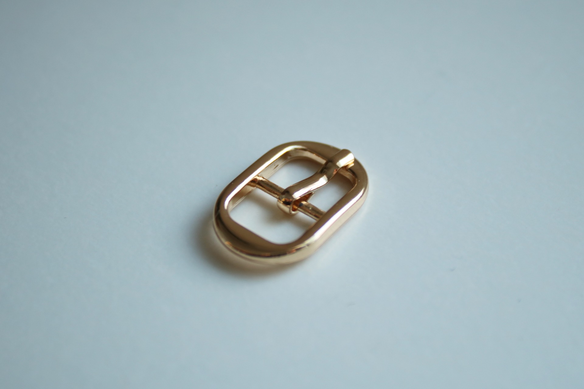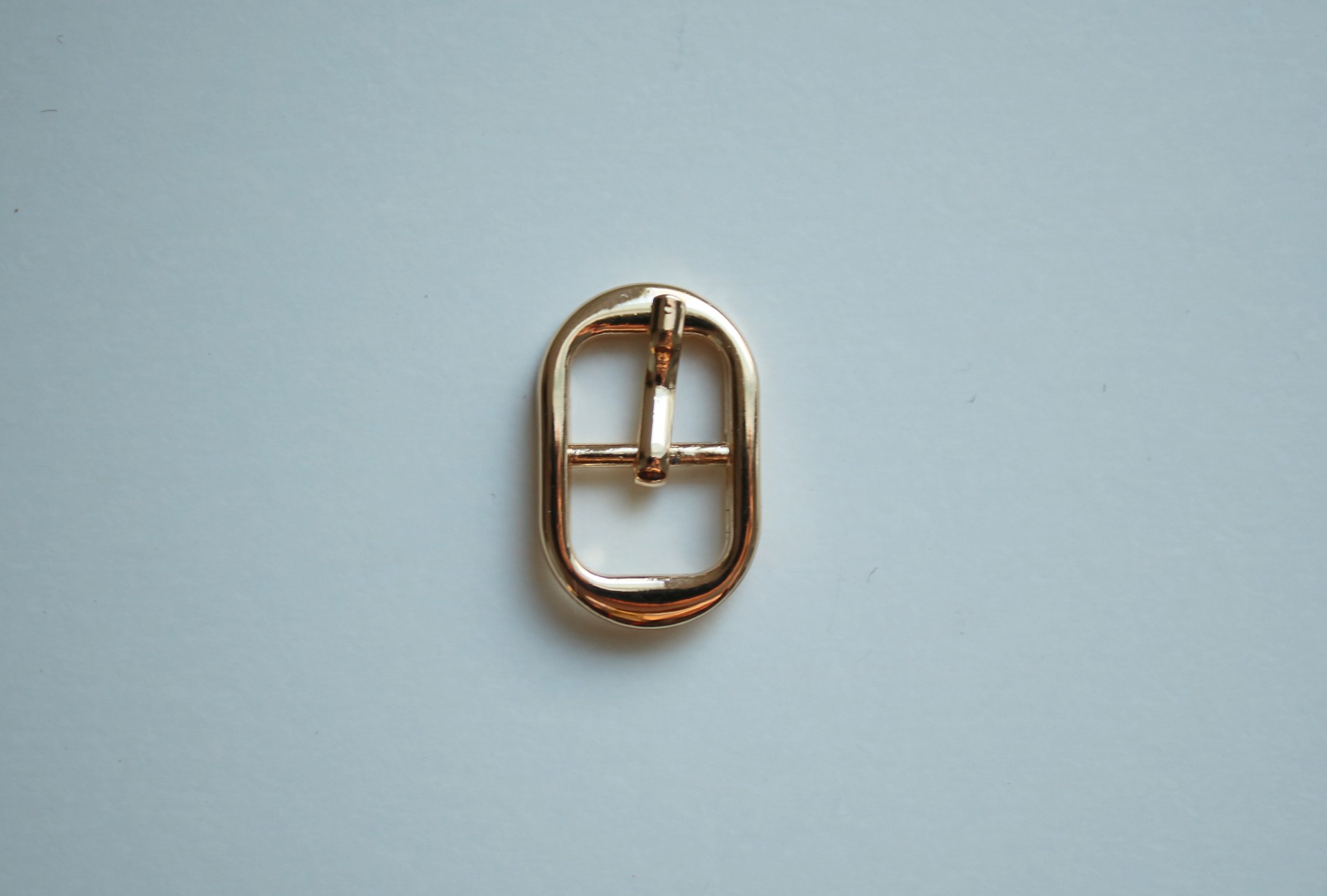 Pieni kullan värinen, metallinen solki, leveys 10 mm (sisähalkaisija), korkeus 15 mm (sisähalkaisija).