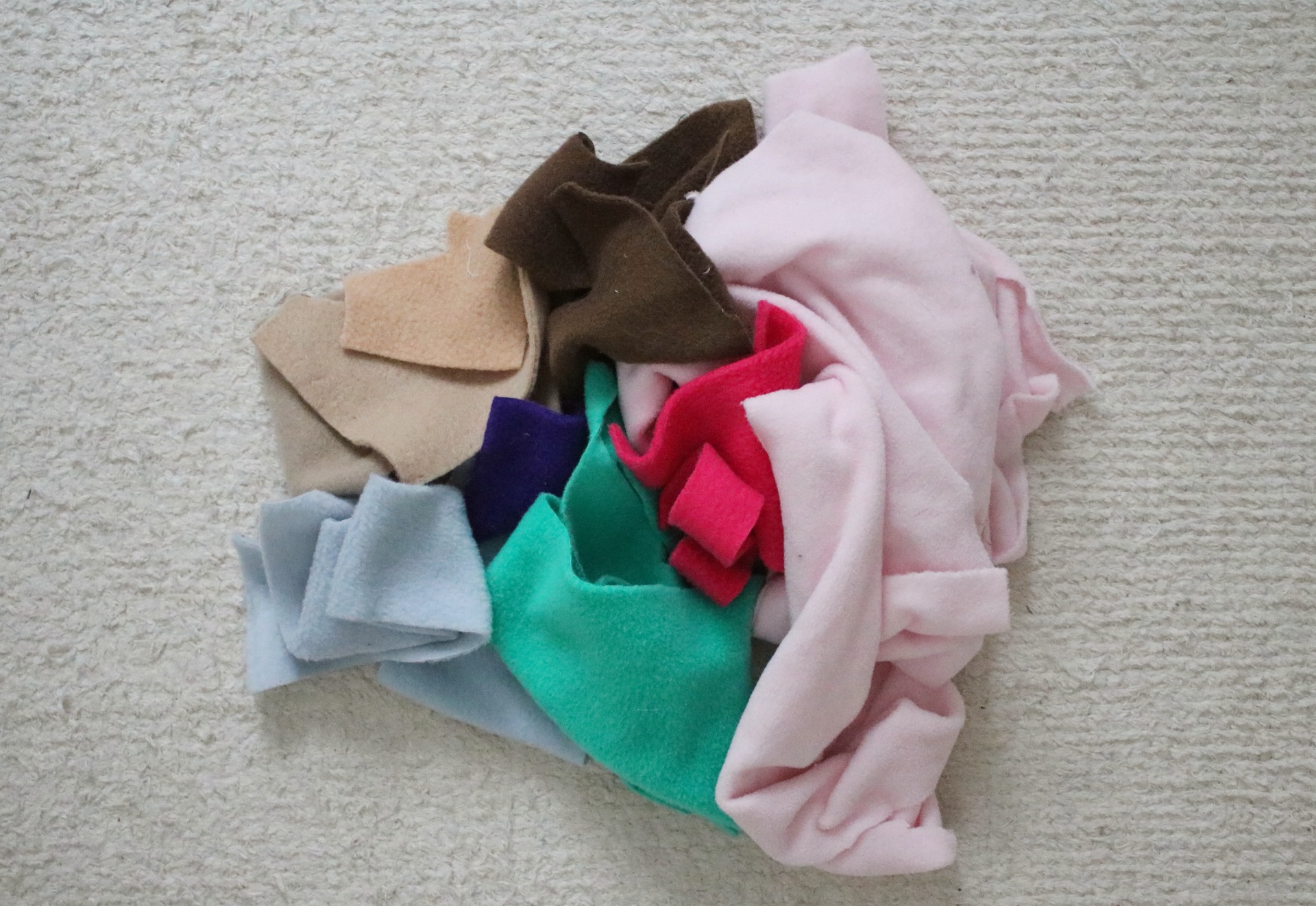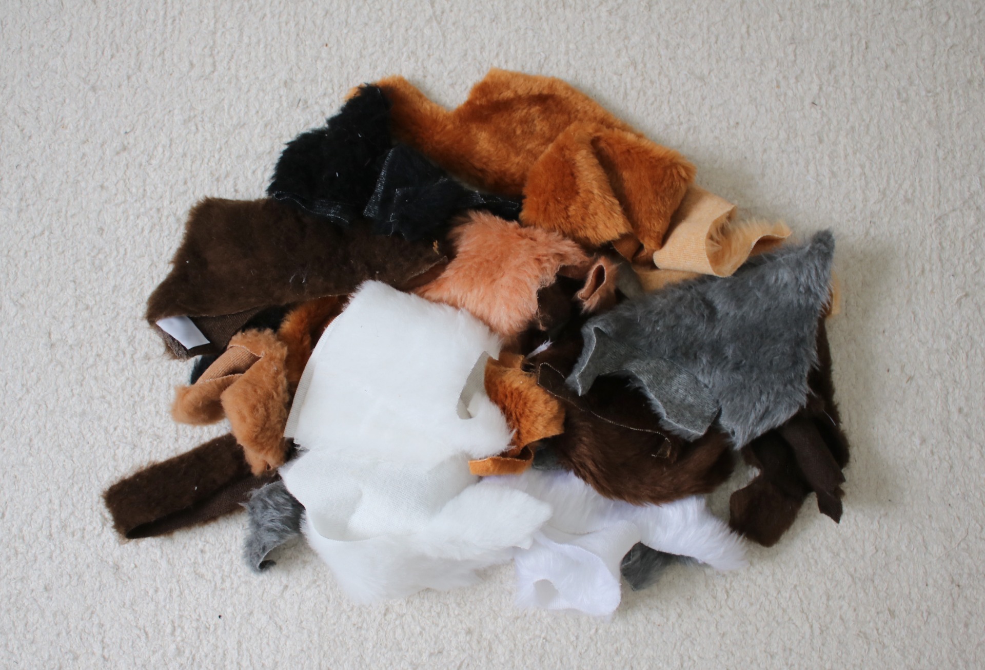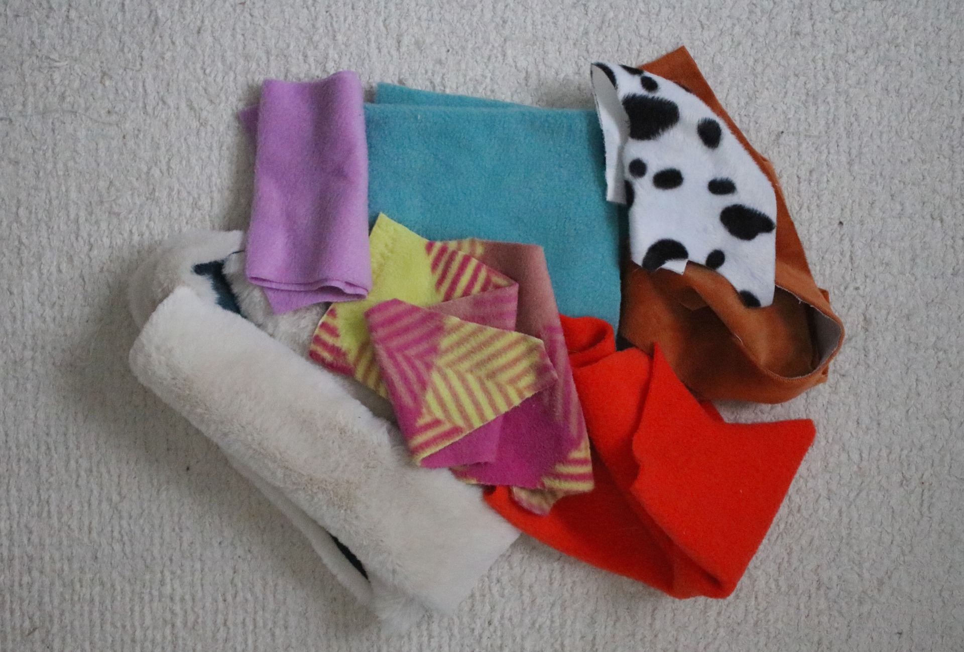 Värit valitsen satunnaisesti sen mukaan, mitä tilkkulaatikosta löytyy. Lähtökohtaisesti karvakankaat, velboat ja mikrovelboat ovat hevosvärisiä (valkoinen, ruskea, kirjava jne.), kun taas fleecestä ja sekavärisestä löytyy myös värillisiä kankaita (pinkki, sininen jne.).